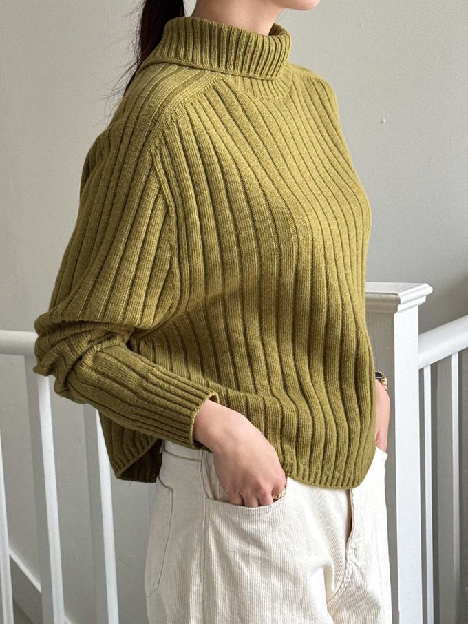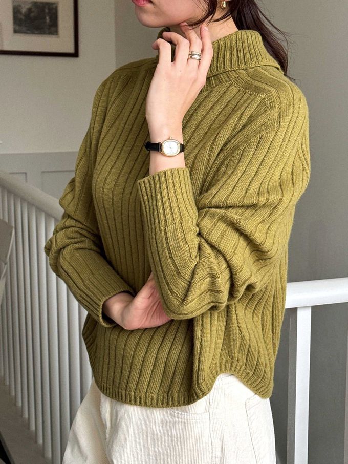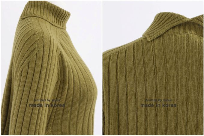 韓國女裝連線 - 柔軟美麗諾羊毛開衩翻領坑條長袖針織上衣-橄欖綠 (FREE)