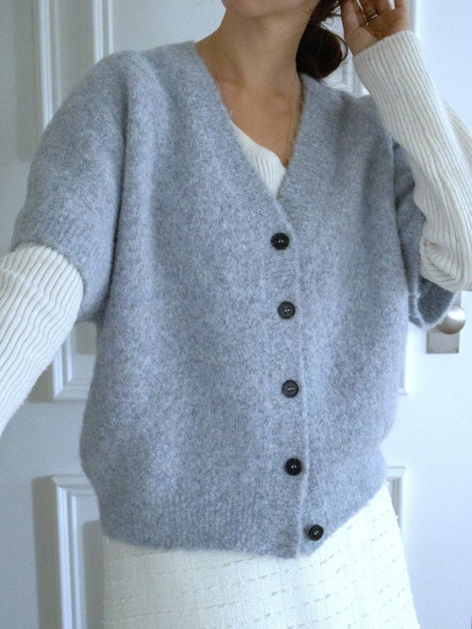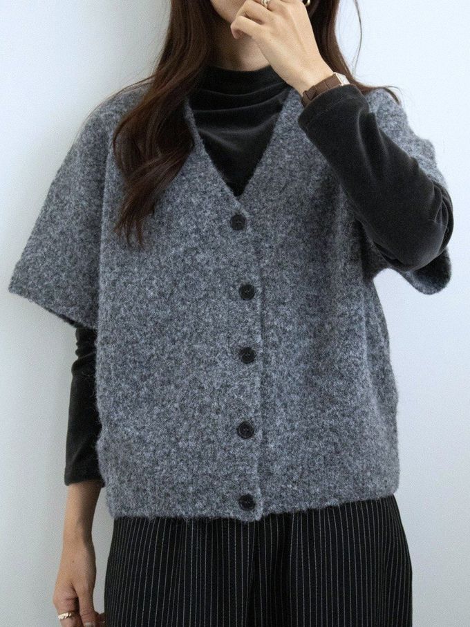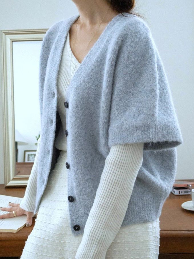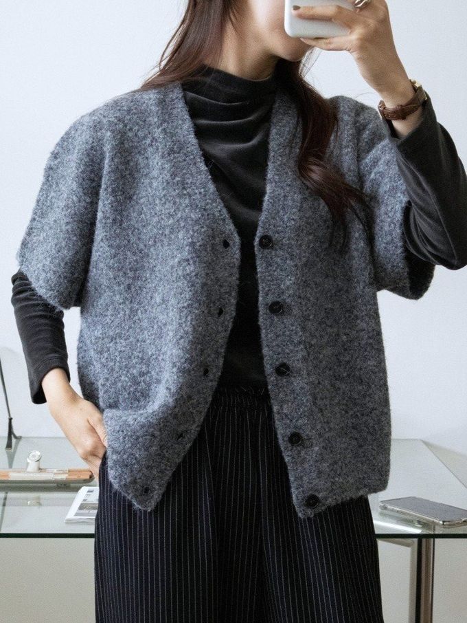 韓國女裝連線 - 知性風格溫暖混羊毛V領背心-淺灰藍 (FREE)