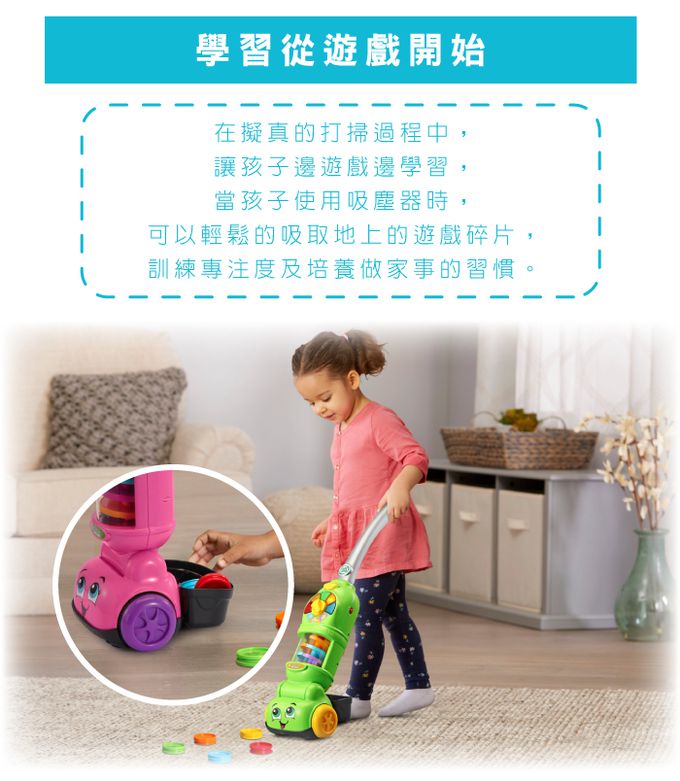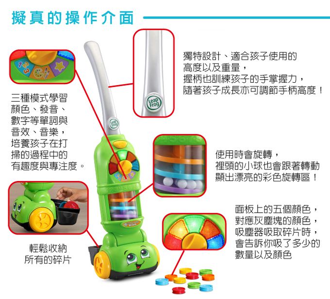 *擬真的吸塵器操作,讓孩子更融入模擬情境*內含五種顏色共十個碎片配件*透過遊戲,了解吸地打掃過程 *多元學習主題-顏色/數字/排序/配對*培養孩子記憶力、想像力、人際關係及情緒表達*碎片可存放在附帶的垃圾桶中,並在遊戲結束後輕鬆收取*手柄傾斜度有兩段式可調節,以實現“成長”的樂趣和學習