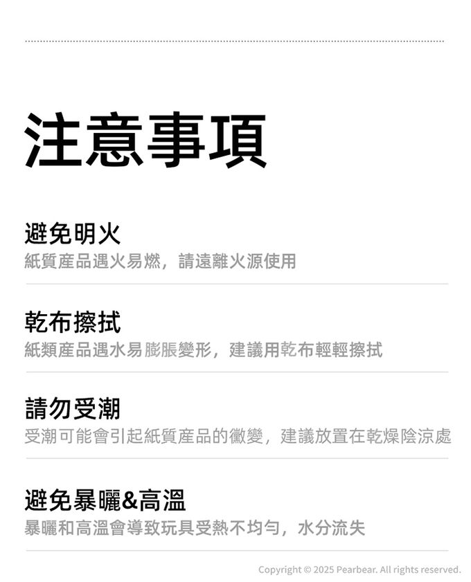 注意事項:為維護兒童安全,請在成人監督下使用,本玩具內 含小物件,有銳邊或尖端,或者兩者皆有,不適合 未滿3歲兒童使用,且應避免吞食造成窒息。為避 免嬰兒或兒童產生窒息之危險,請於拆卸後,立即 將塑膠袋遠離嬰兒及兒童。請遠離火源。