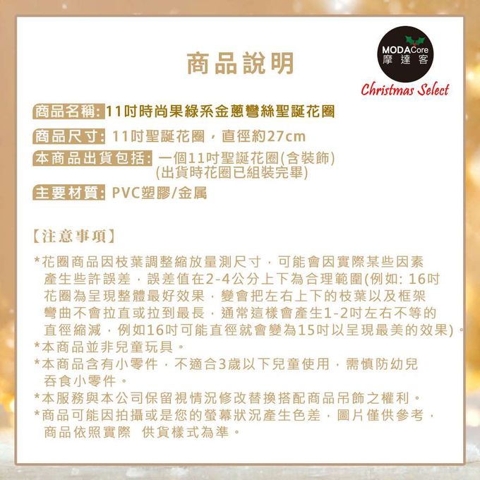 品名:11吋時尚果綠系金蔥彎絲聖誕花圈_台灣工藝免組裝_本島免運費