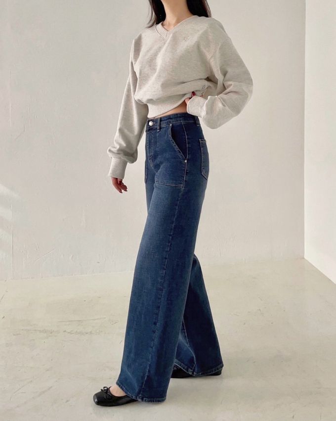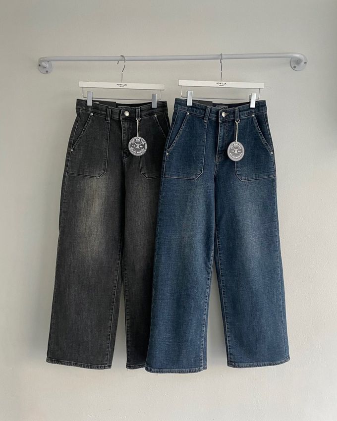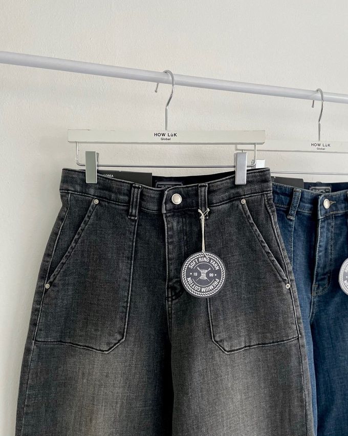 韓國女裝連線 - Howluk (內磨毛)彈性腰高級環紡大口袋丹寧寬褲-黑灰