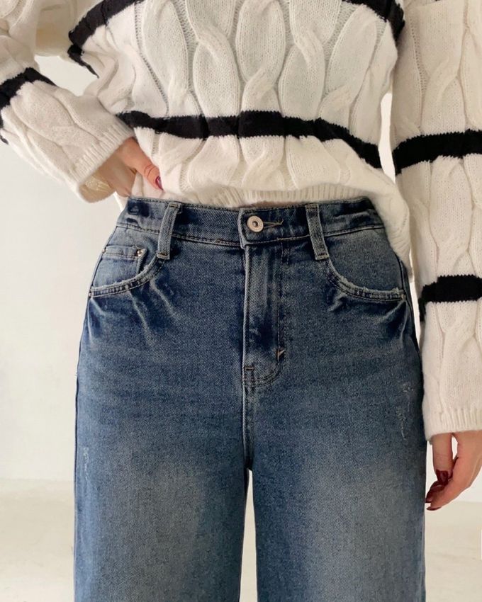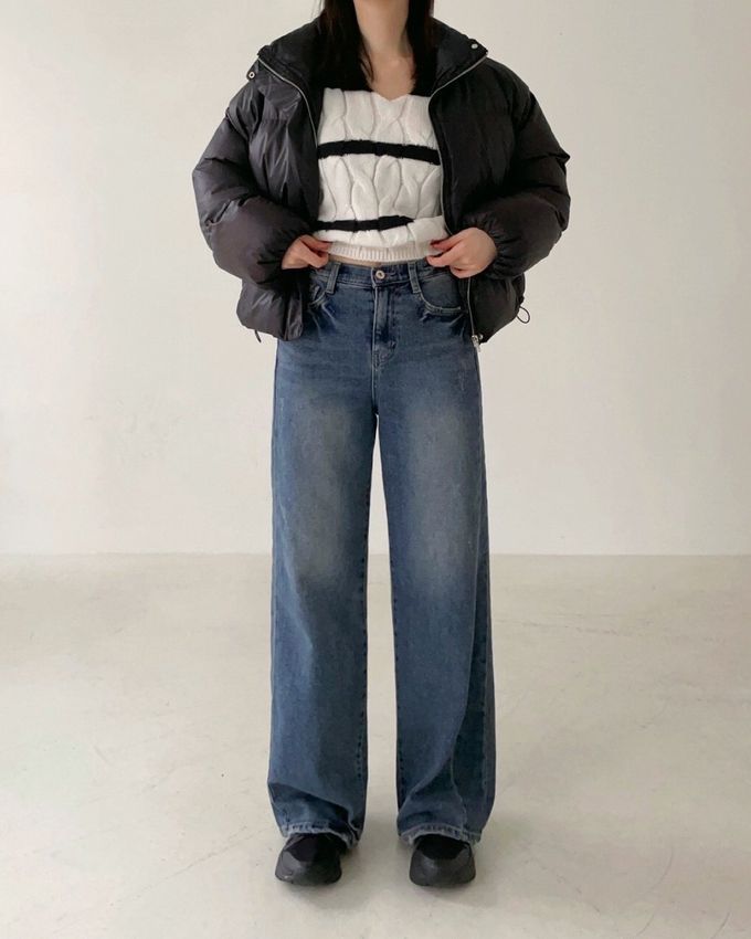 韓國女裝連線 - Howluk (內磨毛)彈性腰復古刷色拼接寬褲-淺花藍