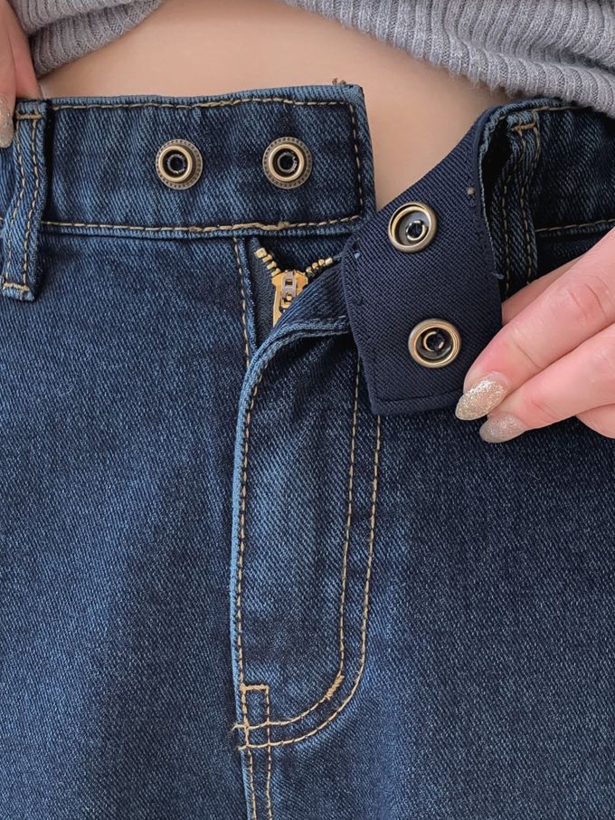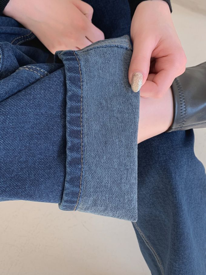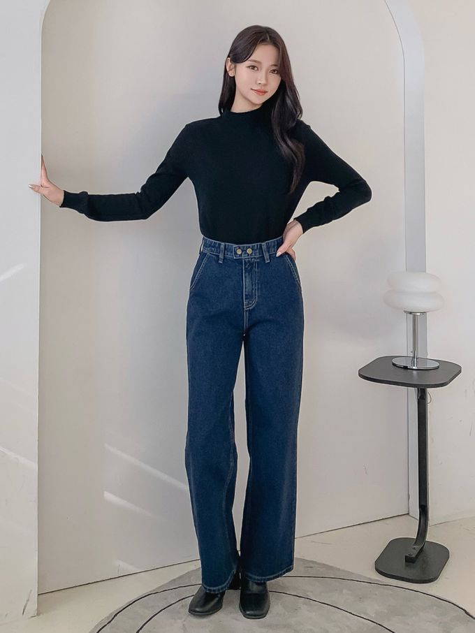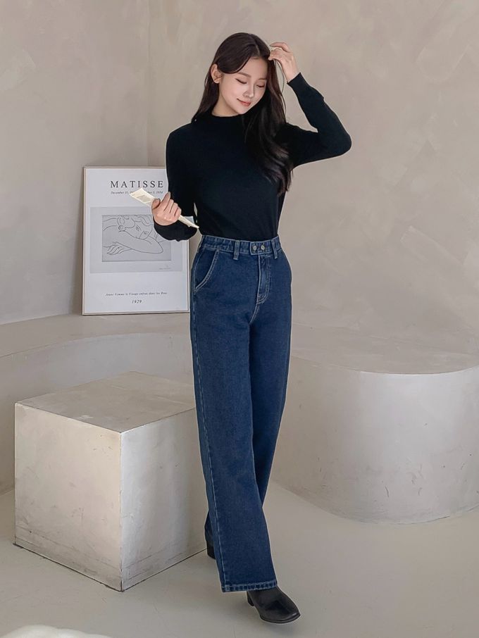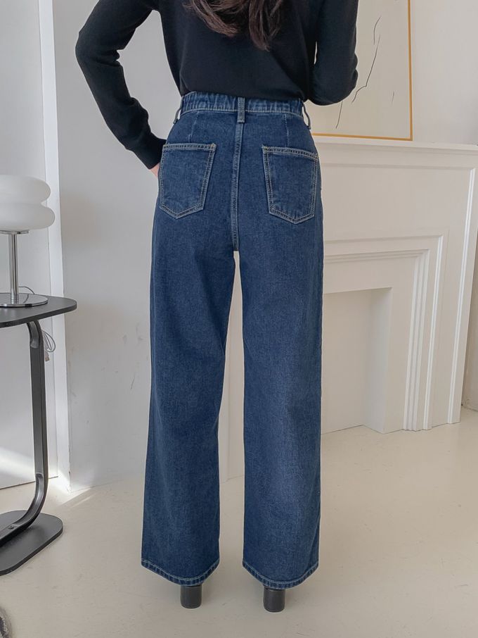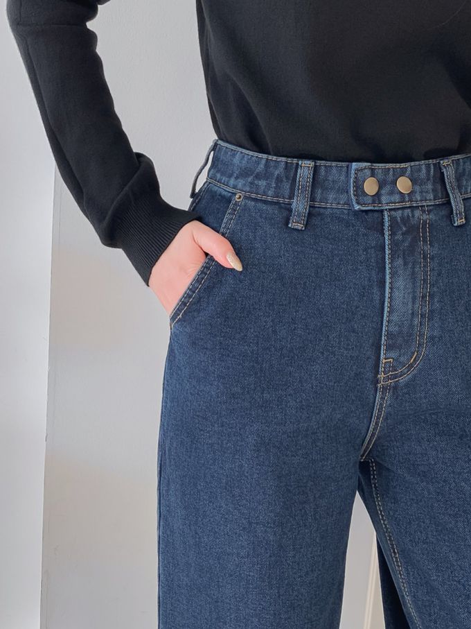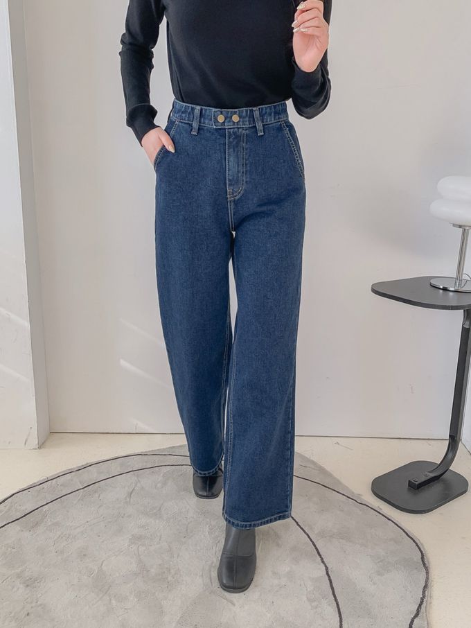 韓國女裝連線 - EDITION (內磨毛)彈性腰造型雙釦長腿直筒褲-深藍