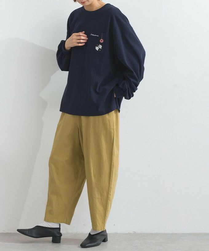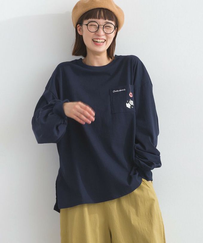 日本 Lupilien - 俏皮動物刺繡純棉長袖上衣-貓熊-海軍藍