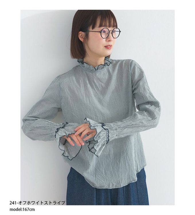 日本 Lupilien - 荷葉領輕盈皺摺長袖上衣(疊穿推薦)-淺藍細條紋