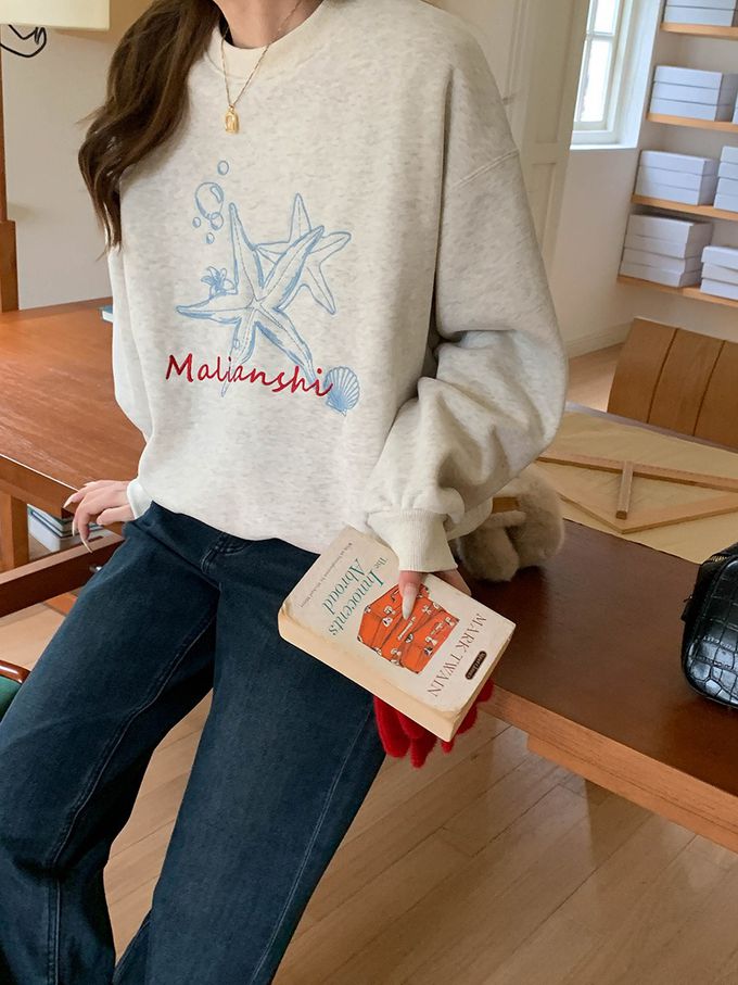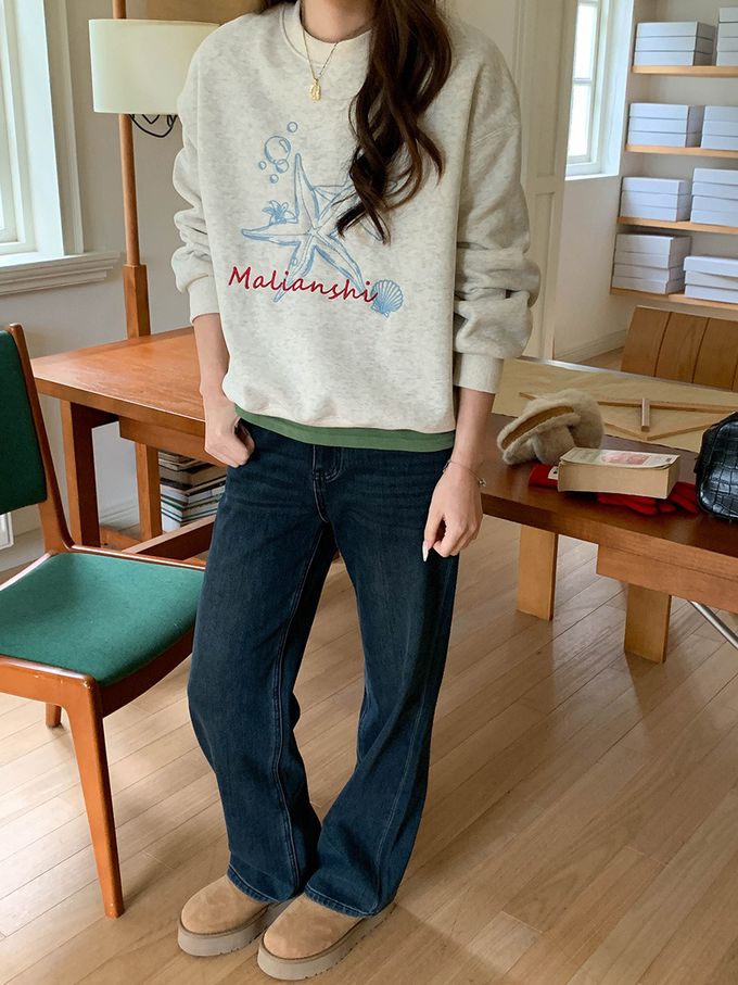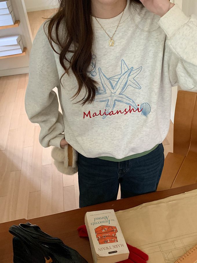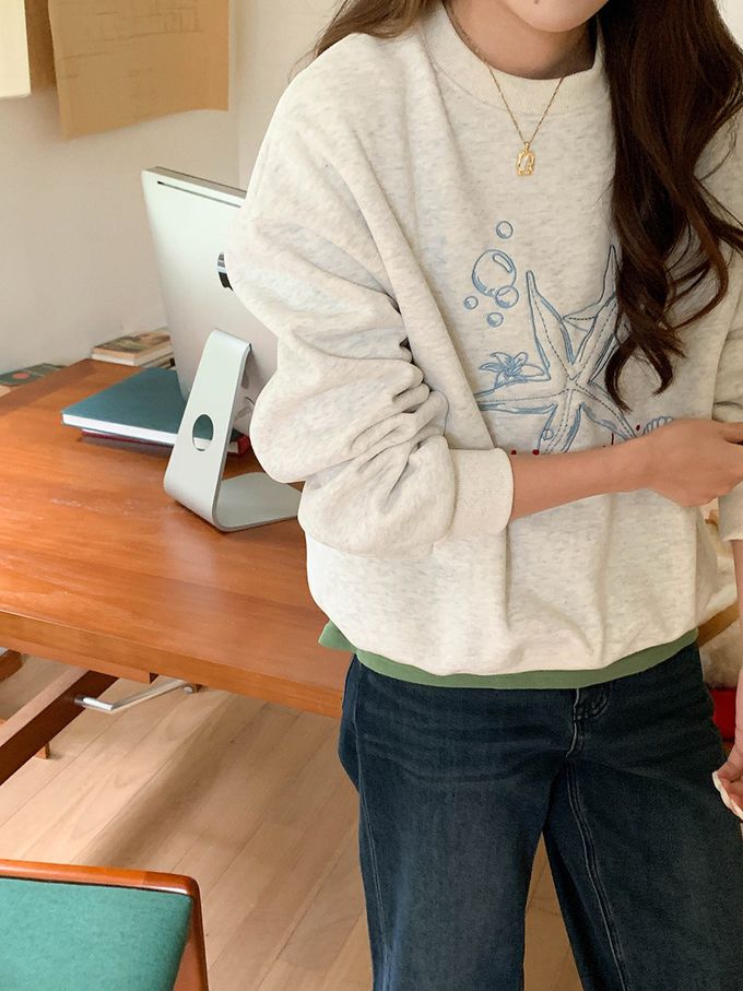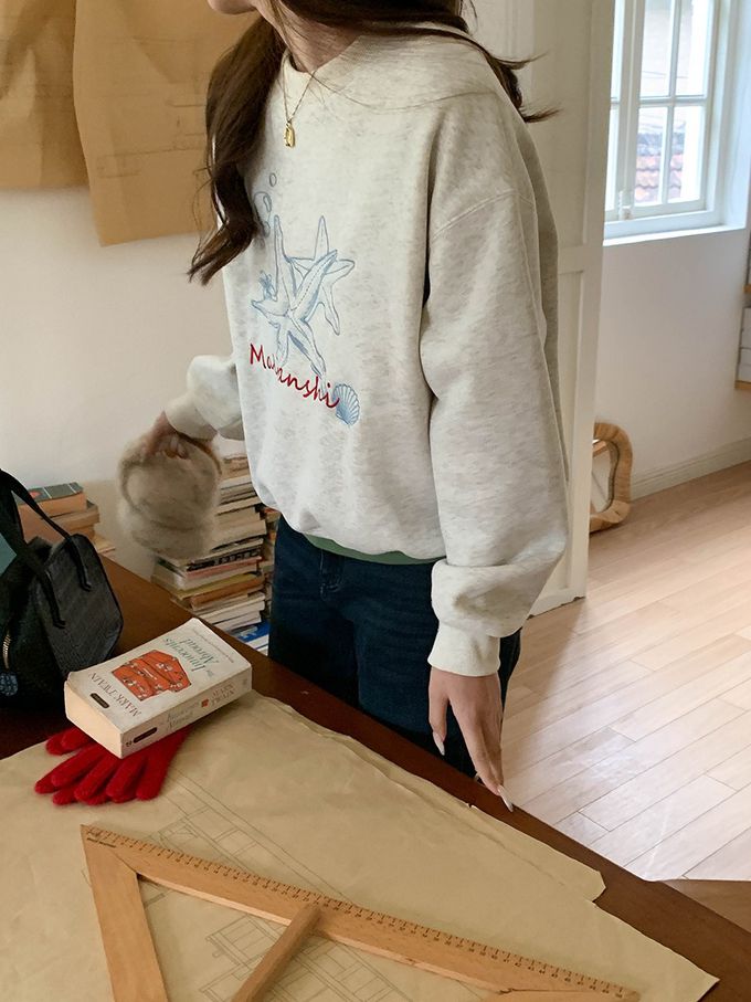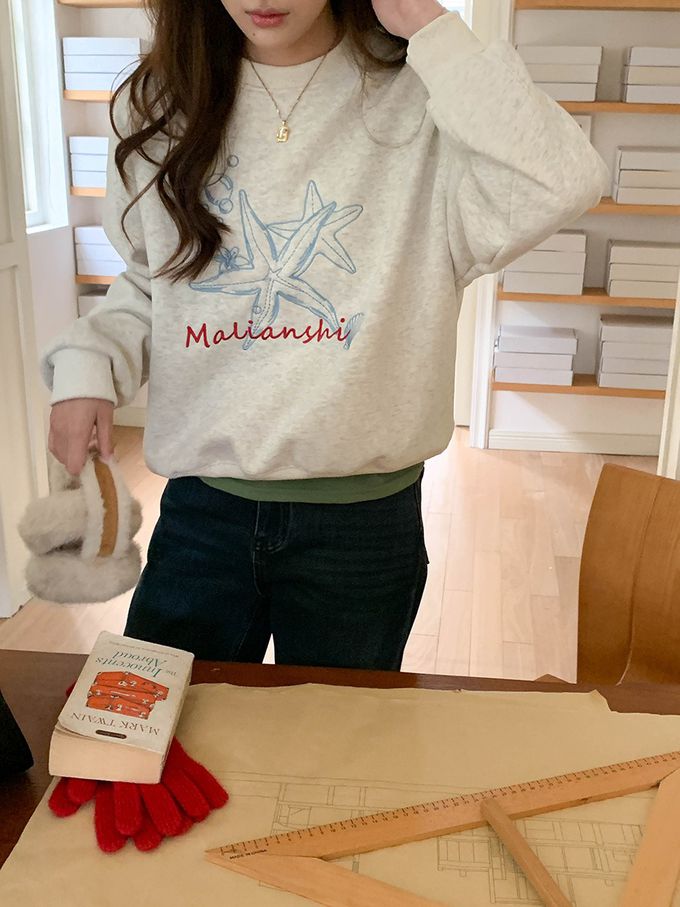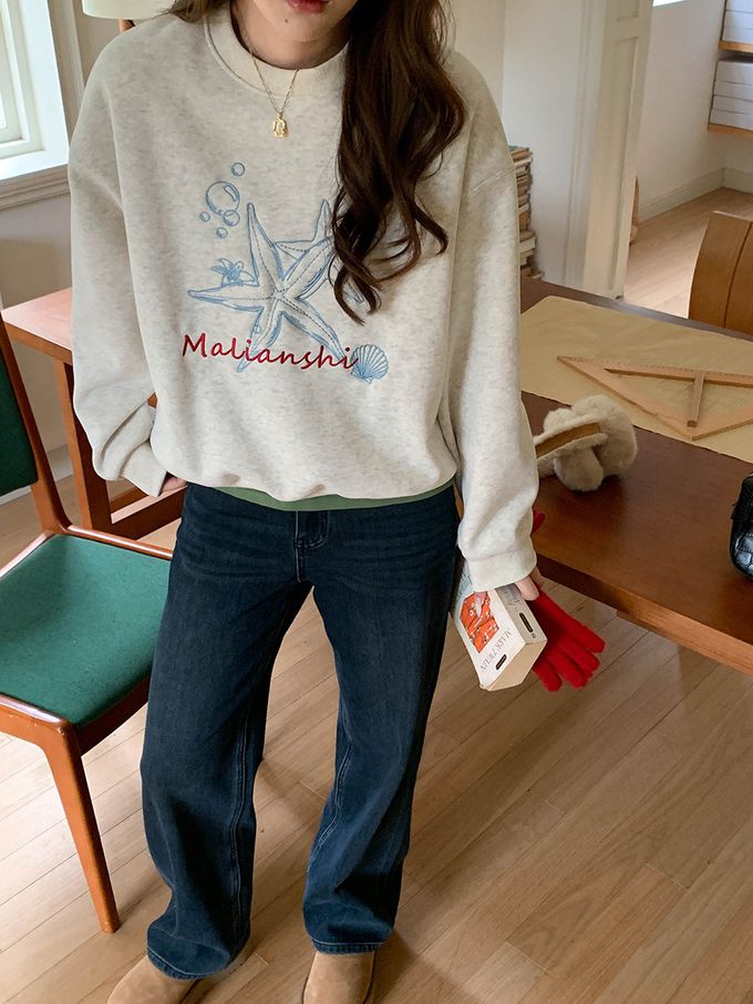 3th Morning - (加絨)長袖大學T-刺繡海星-麻白 (F)
