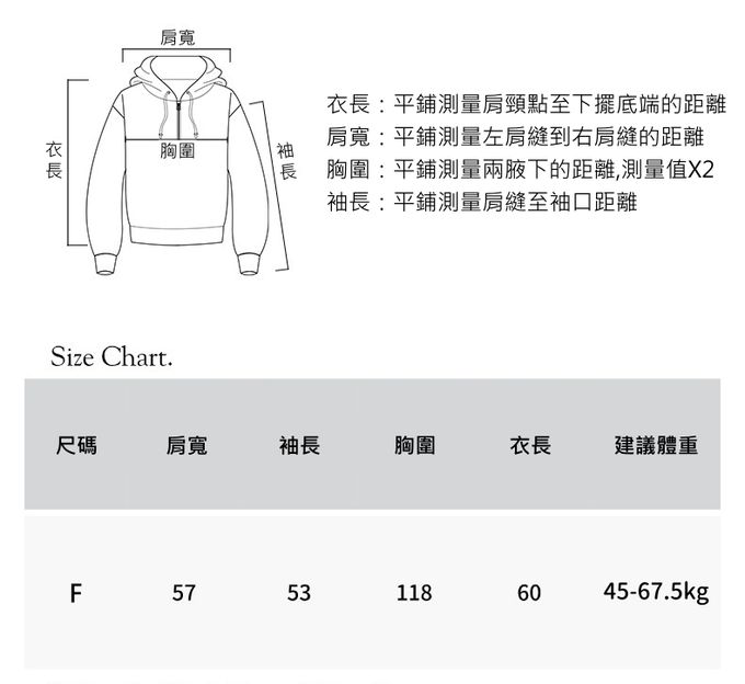 1. 尺寸表單位皆為公分(cm),商品皆為平鋪測量,實際尺寸會因布料彈性、水洗、測量起迄點等因素略有誤差,敬請諒解。