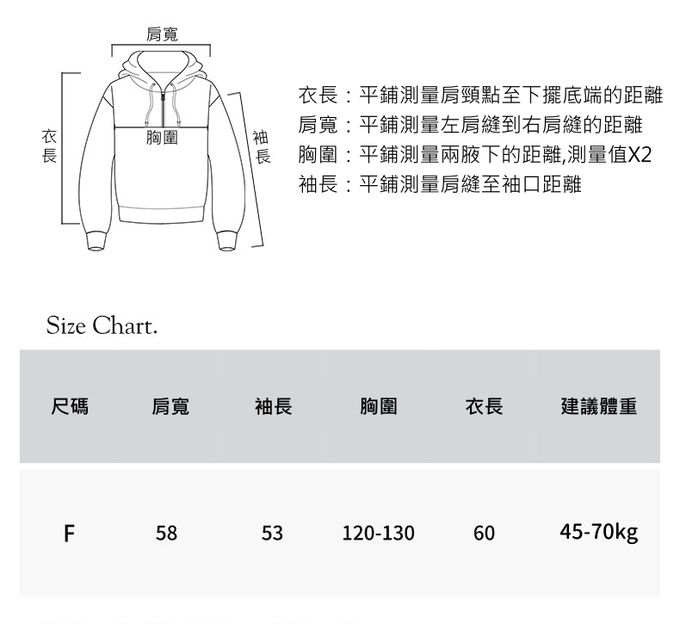 1. 尺寸表單位皆為公分(cm),商品皆為平鋪測量,實際尺寸會因布料彈性、水洗、測量起迄點等因素略有誤差,敬請諒解。