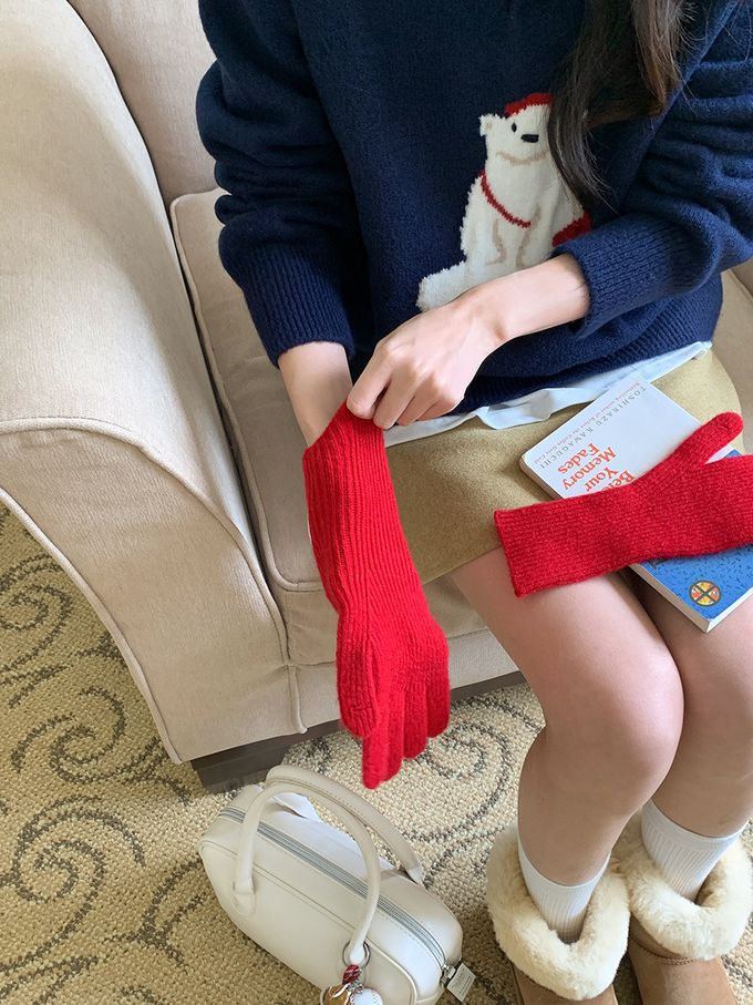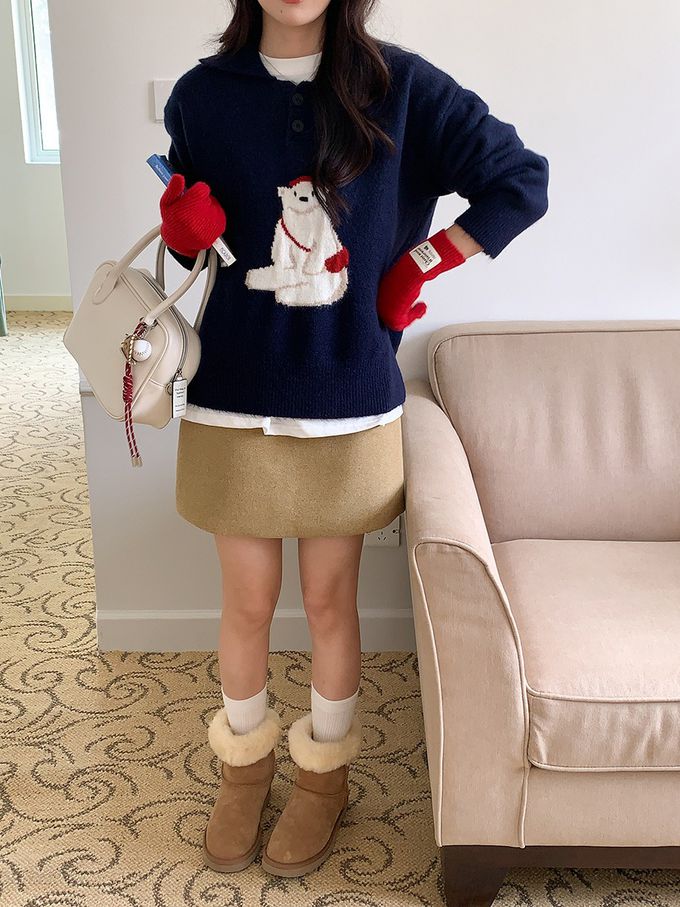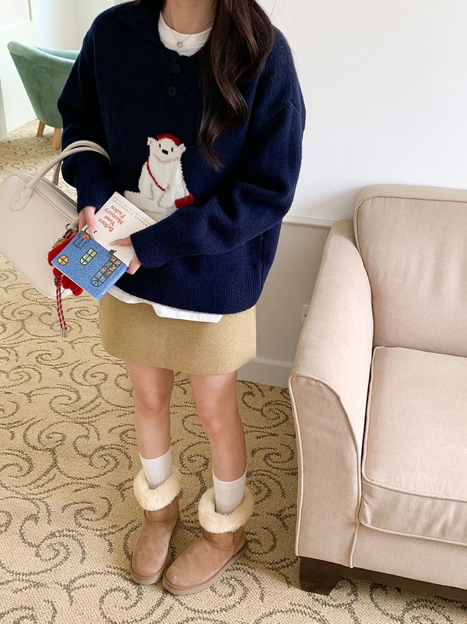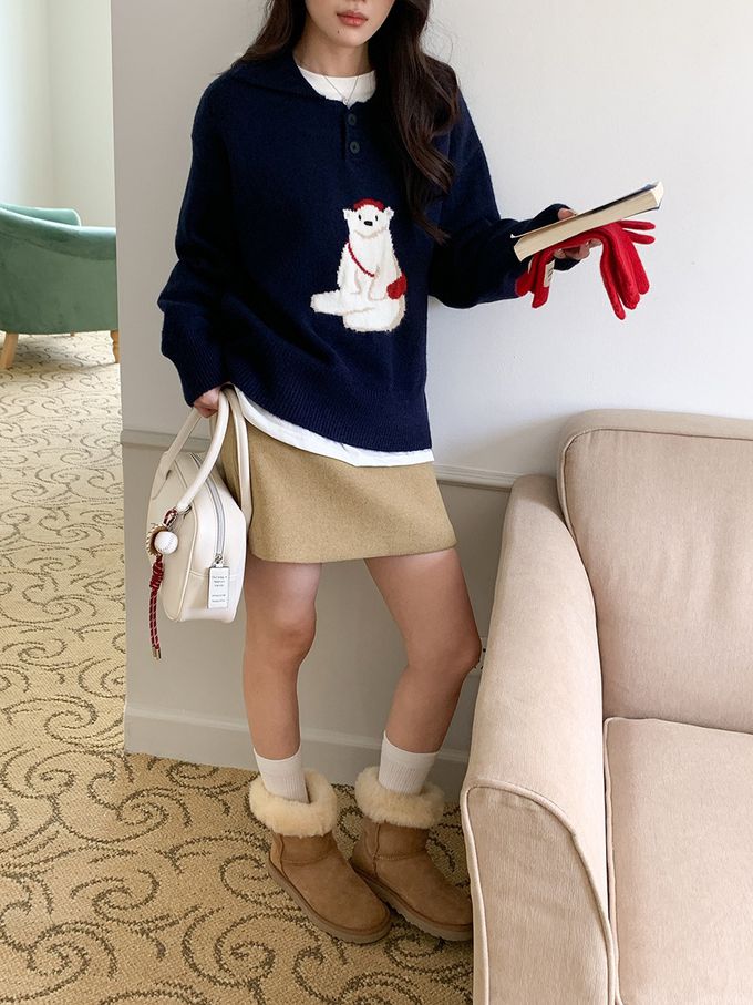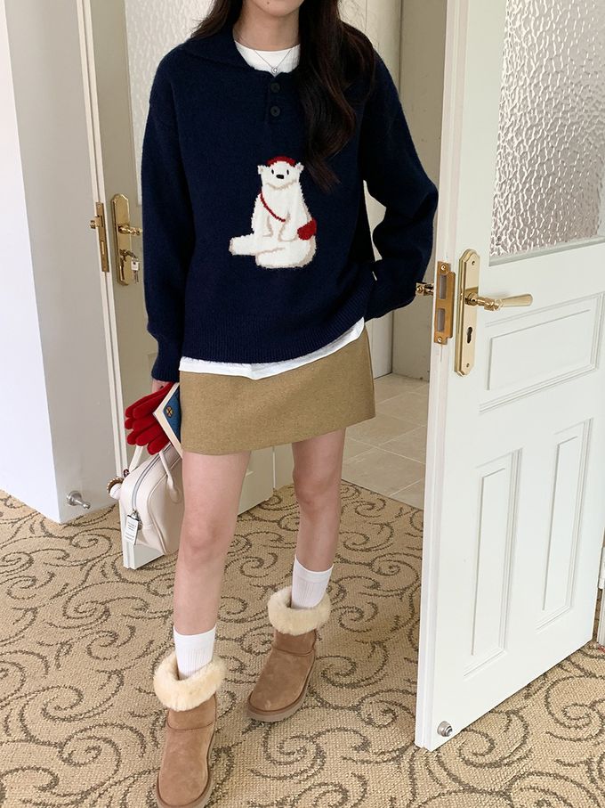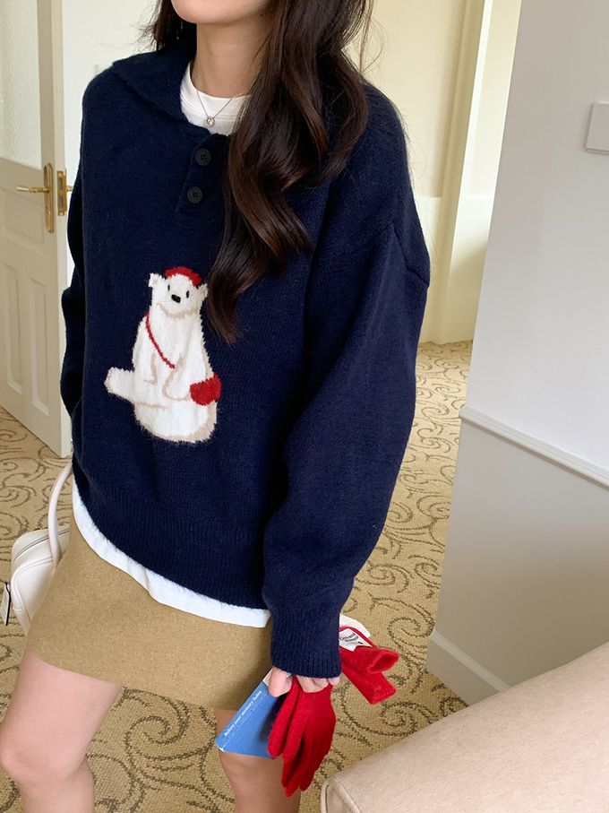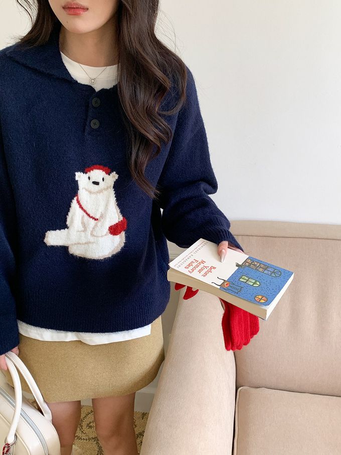 3th Morning - 雙釦翻領長袖針織上衣-北極熊-藏青 (F)