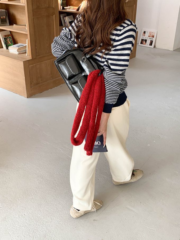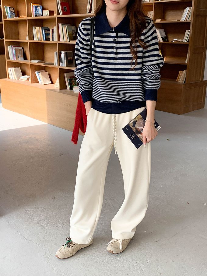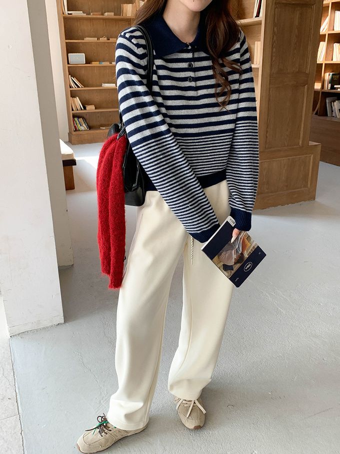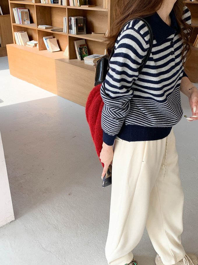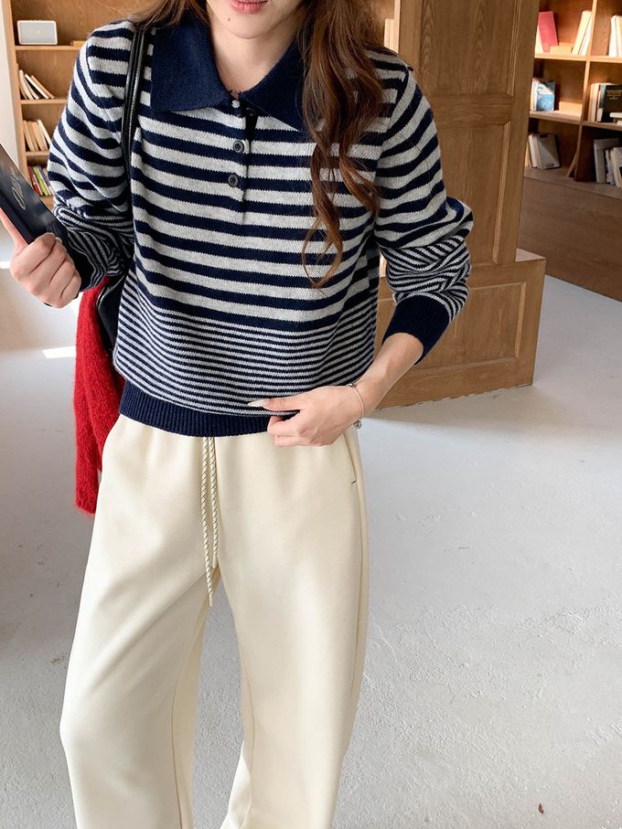 • 品名:韓系條紋翻領長袖針織上衣