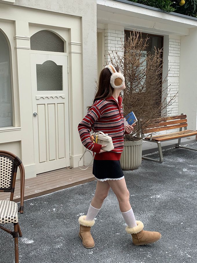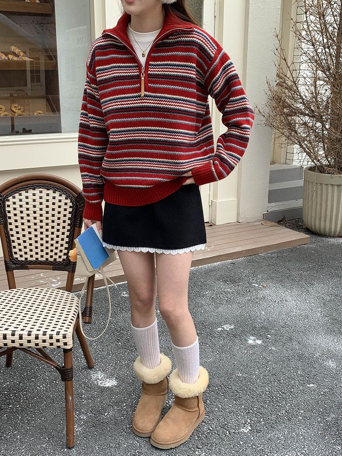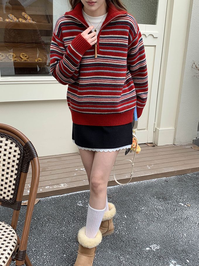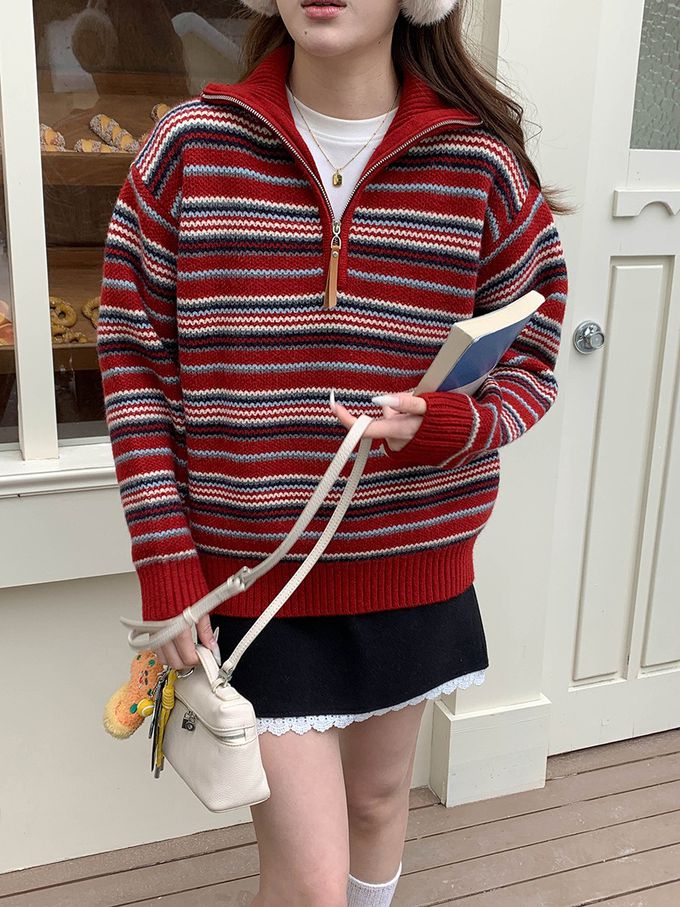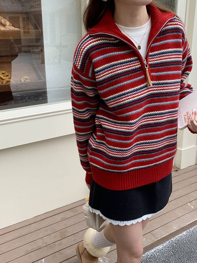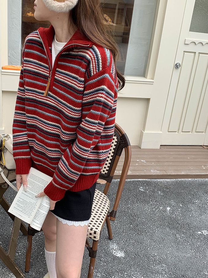 • 品名:慵懶風格半拉鏈條紋長袖針織上衣
