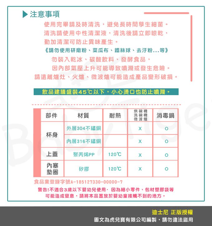 材質:杯身外層304不鏽鋼、杯身內層316不鏽鋼、上蓋聚丙烯PP、墊圈矽膠