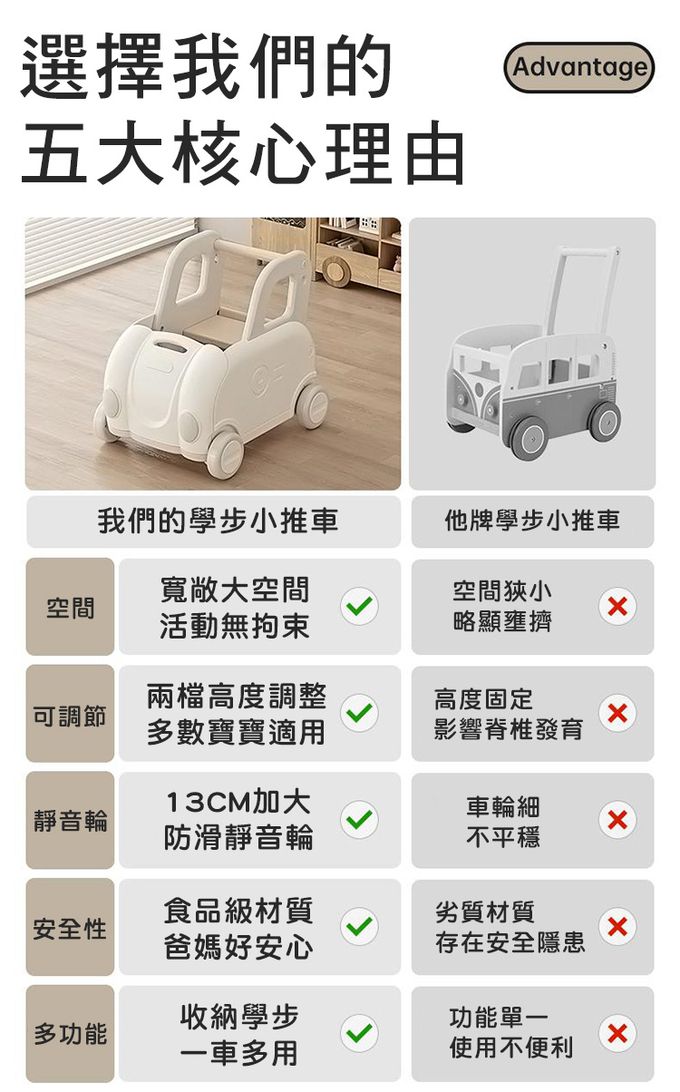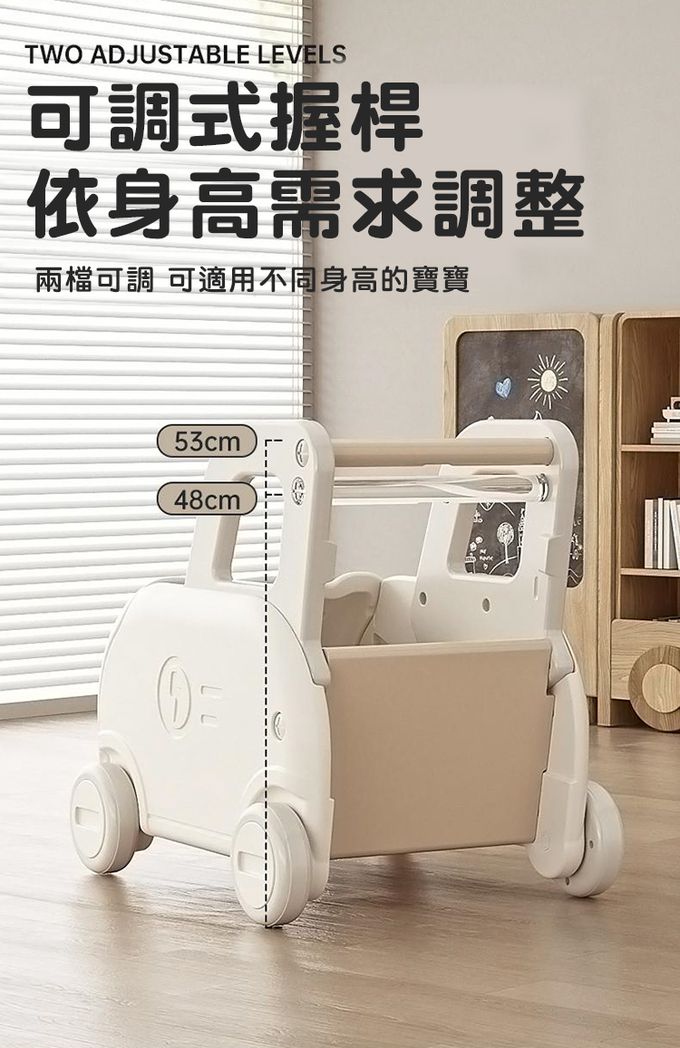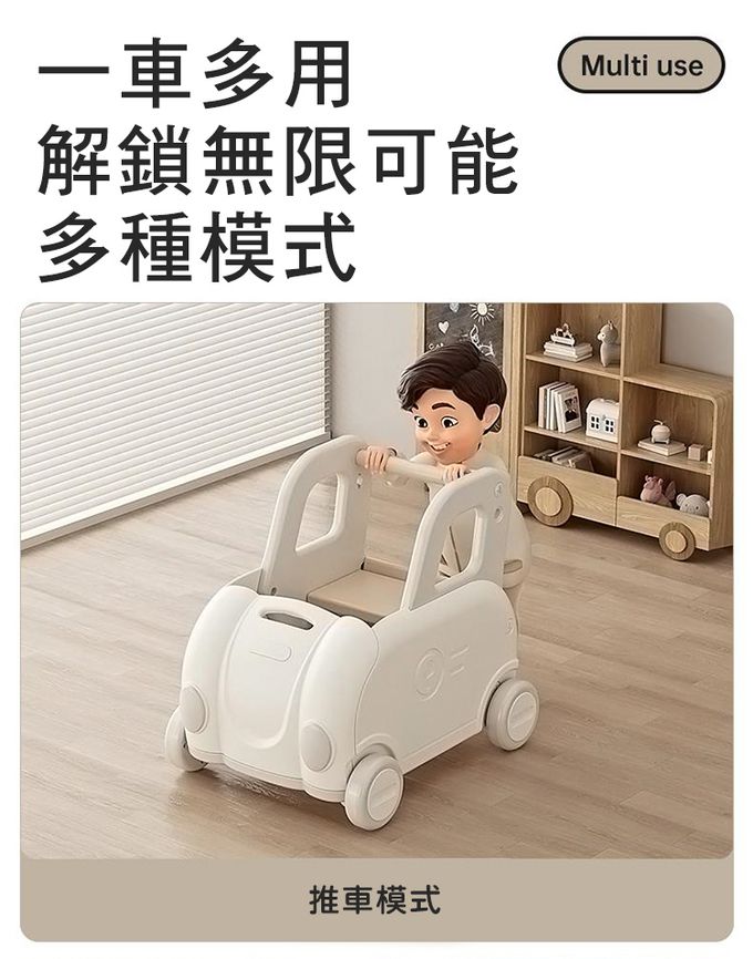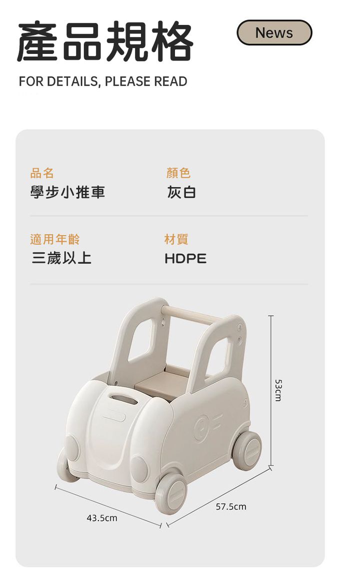 ⭐️ 可愛的汽車造型陪伴寶寶快樂成長⭐️ 二段高度可調式設定⭐️ 食品級環保材質,安全穩固⭐️ 13CM加大防滑靜音車輪⭐️ 學步/收納/遊戲,一車多用途【規格】:57.5cm X 43.5cm X 53cm【材質】:HDPE【使用年齡】:3歲以上【產地】:中國