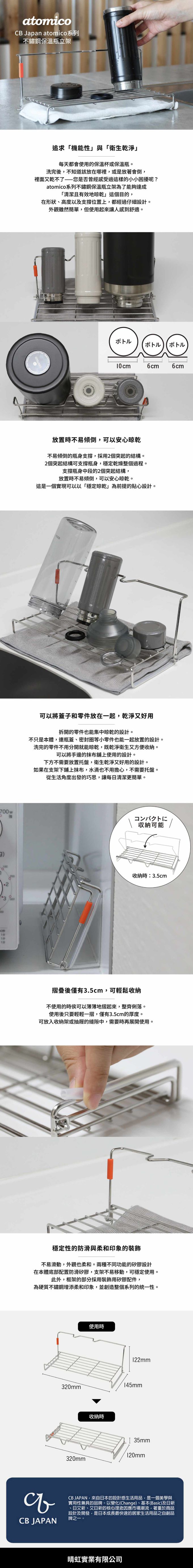 此款不鏽鋼保溫瓶立架,不只是本體,連瓶蓋、密封圈等小零件也能一起放置晾乾。立架中的2個突起結構可支撐瓶身不易傾倒,穩定乾燥整個過程。摺疊後僅有3.5cm,可輕鬆收納。不使用時,可放入收納架或抽屜的縫隙中,需要時再展開使用。
