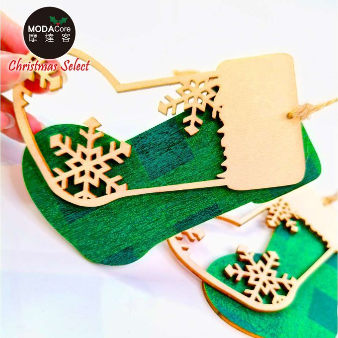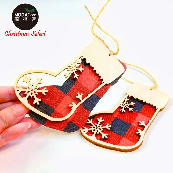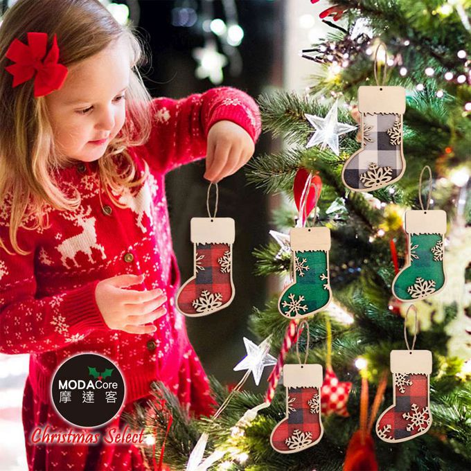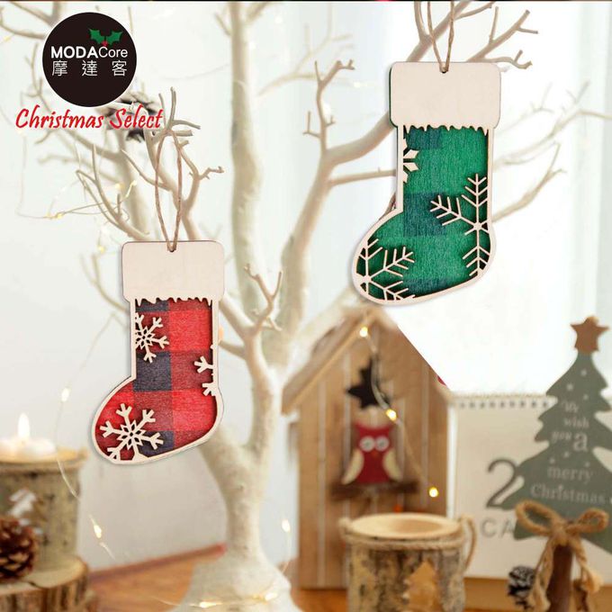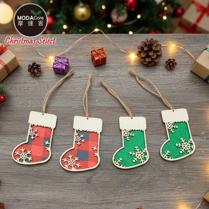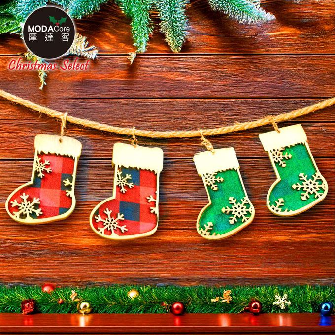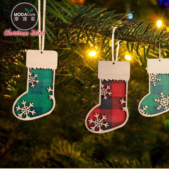 紅綠格紋木質彩繪聖誕襪造型吊飾4件組-交換禮物耶誕派對佈置