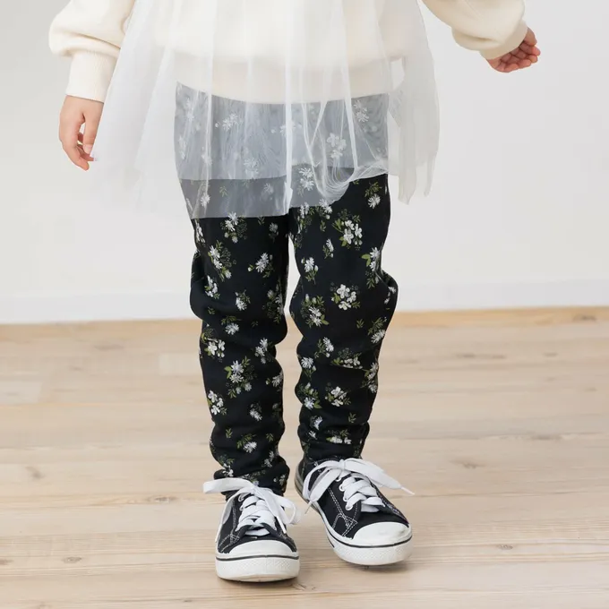 日本 Chil2 - 熱銷!刷毛保暖彈力合身長褲-大花-黑