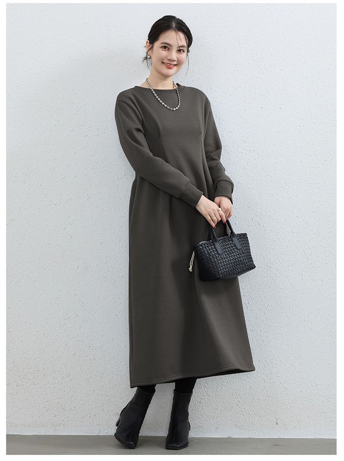 Yukié - (內裡加絨)休閒感抓褶修身剪裁長袖洋裝-深灰