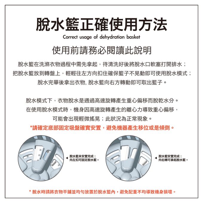 注意事項:脫水籃使用注意事項: 脫水籃在洗滌衣物過程中需先拿起,待清洗好後將脫水口軟塞打開排水: 把脫水籃放到轉盤上,輕輕往左方向扣住確保籃子不晃動即可使用脫水模式; 脫水完畢後拿出衣物,脱水籃向右方轉動即可取出籃子。 脫水模式下,衣物脫水是通過高速旋轉產生重心偏移而脫乾水分。 在使用脫水模式時,機身因高速旋轉產生的離心力導致重心偏移, 可能會出現輕微搖晃:此狀況為正常現象。 *請確定底部固定吸盤確實安置,避免機器產生移位或是傾倒。 *脫水時請將衣物平鋪並均勻放置於脫水籃內,避免配重不均導致機身損壞。 保固:12個月 【特別注意】 ⚠️ 產品保固期限統一依照上述商品內文說明為準。 ⚠️ 保固商品務必保留完整包裝,以免喪失保固權益。 ⚠️ 如遇新品瑕疵,請於7日鑑賞期內進行退換貨申請,逾期恕不受理。 ⚠️ 收到包裹後請務必進行開箱錄影,並請一鏡到底以保障雙方權益。