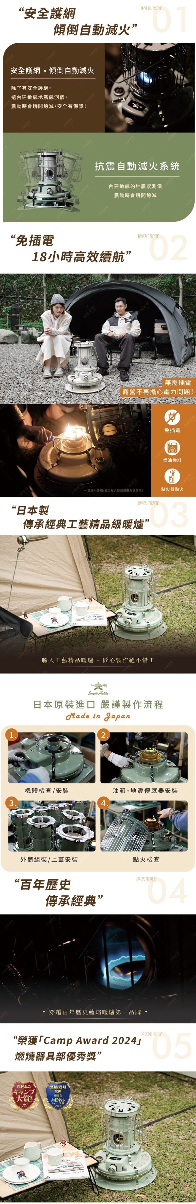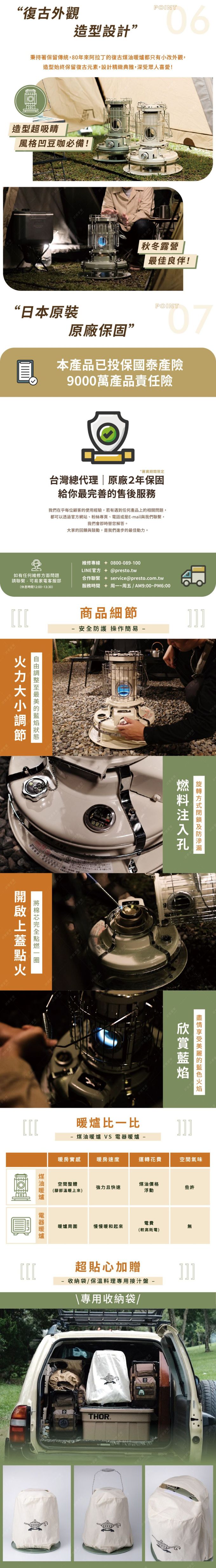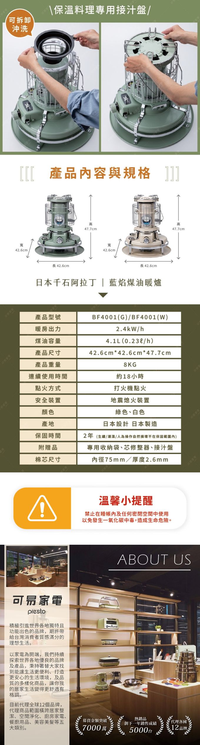 成分:型號:BF-4001 暖房出力:2.4kW/h 煤油容量:4.1L 連續使用時間:約18小時 材質: - 本體-SECE電鍍鋅鋼板(粉體塗裝處理) - 外筒/集汁盤/頂板-琺瑯材質 - 爐架/護罩-鍍鉻材質 尺寸:長 42.6 x 寬 42.6 x 高 47.7 (cm) 重量:8kg 配件:專用收納袋、芯修整器、接汁盤、說明書 產地:日本設計/日本製造 保固:保固一年(生鏽/潮濕/人為操作自然損壞不在保固範圍內) ※ 本產品無需商檢證明 ※ 本公司已投保國泰產物產品責任保險證號1516字第14PD02866號