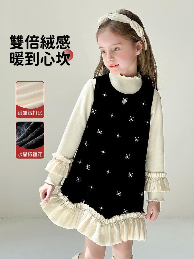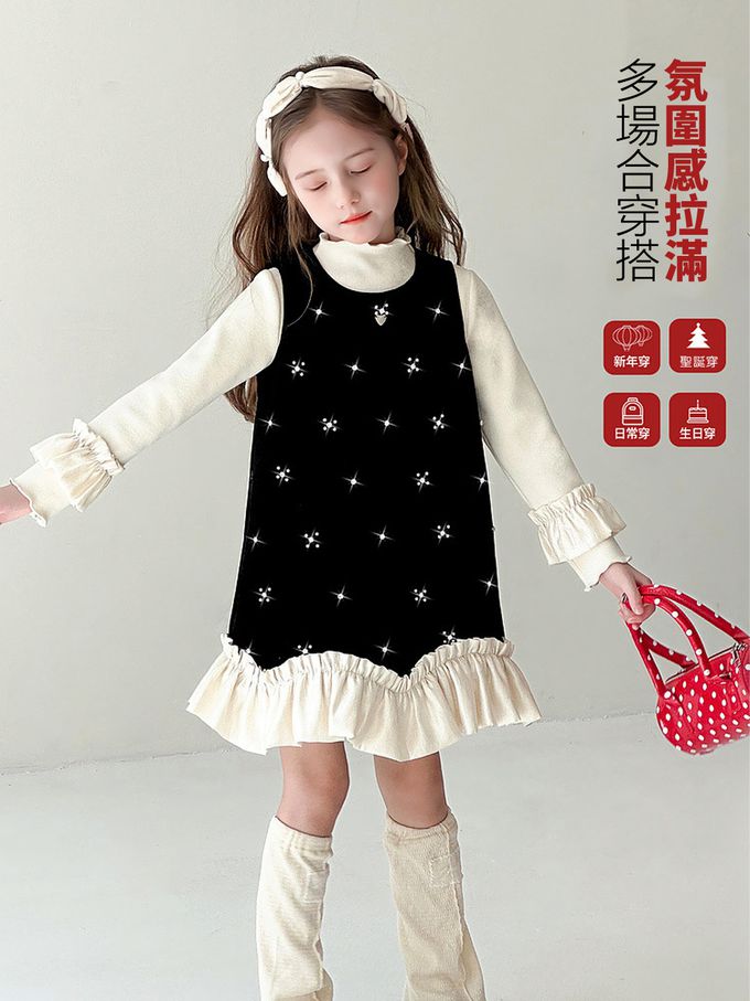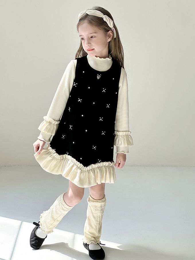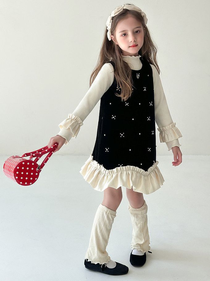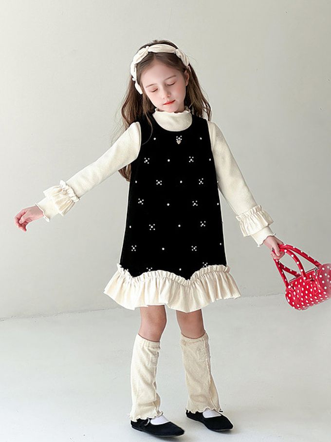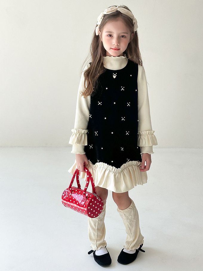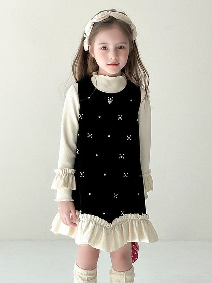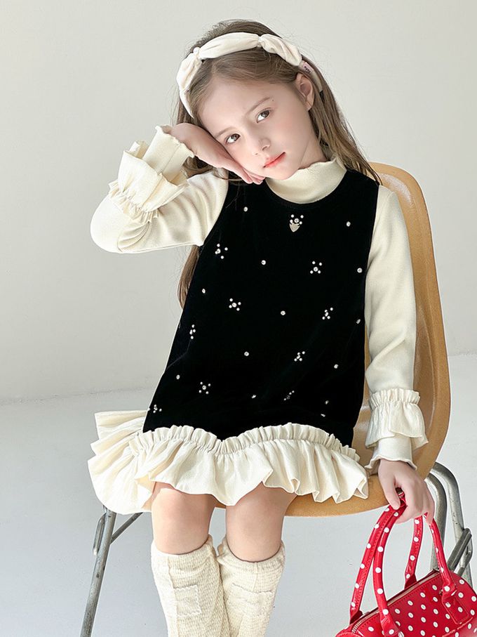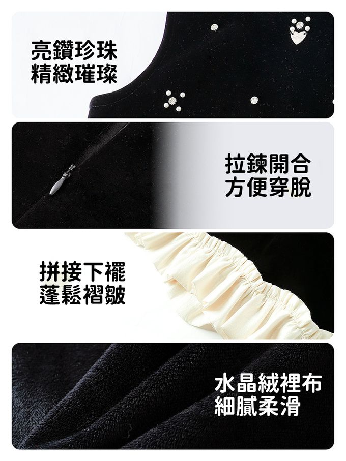 精緻珍珠亮鑽背心裙(不含內搭長袖)-荷葉下襬-黑色