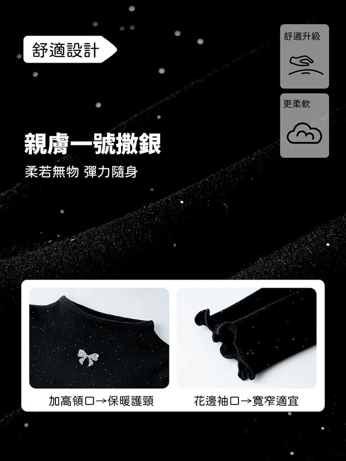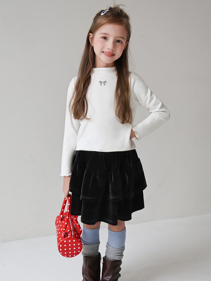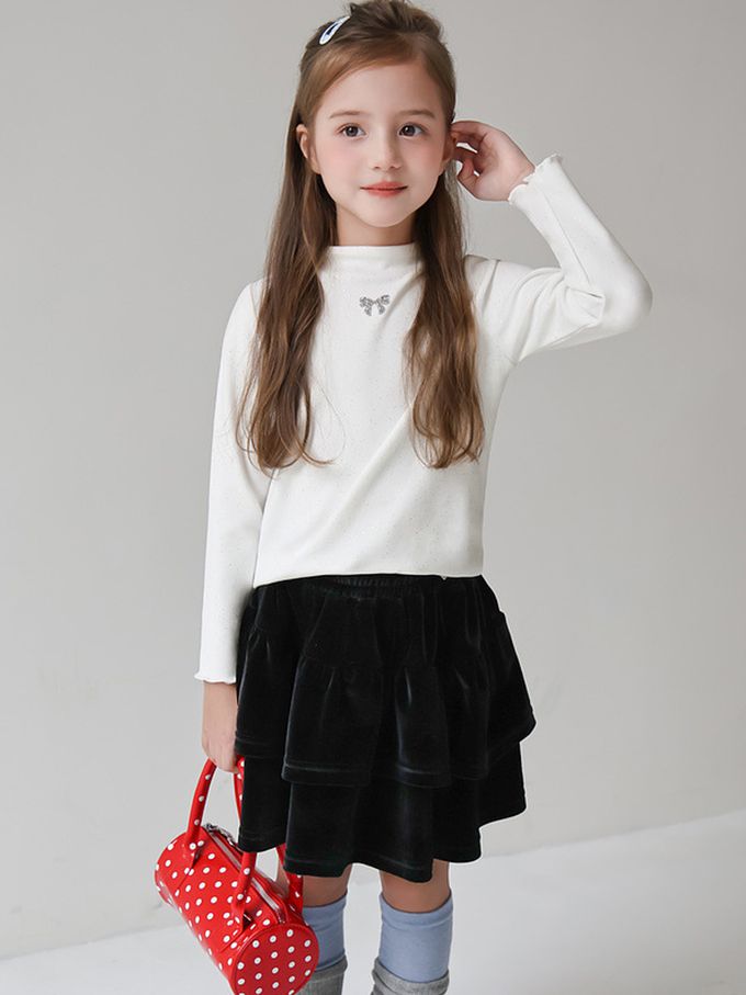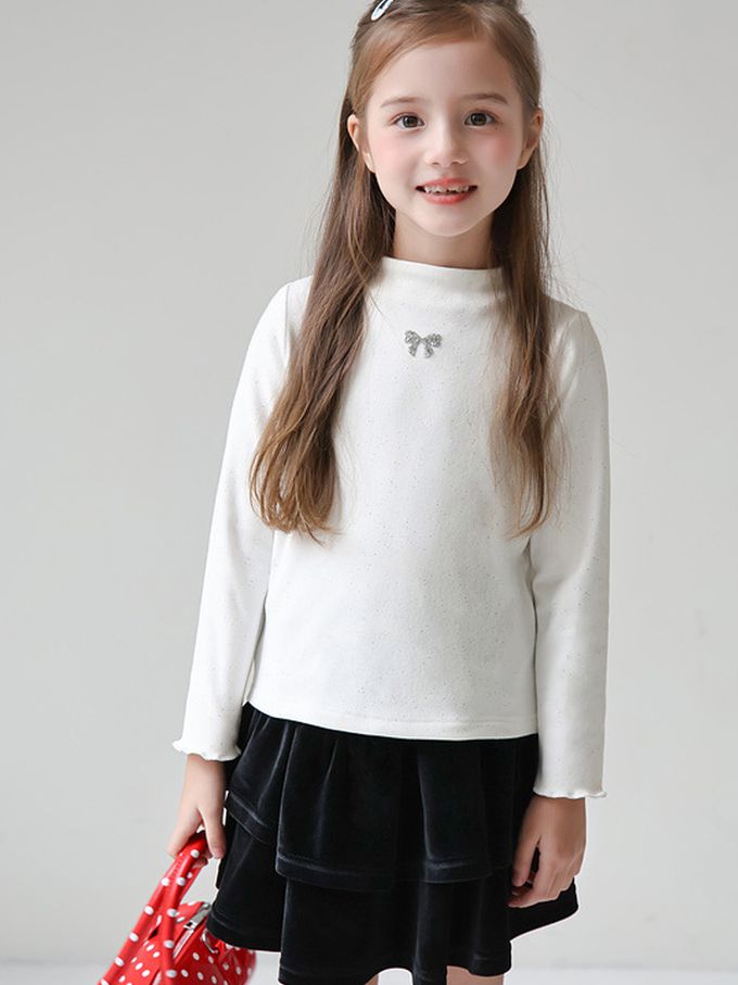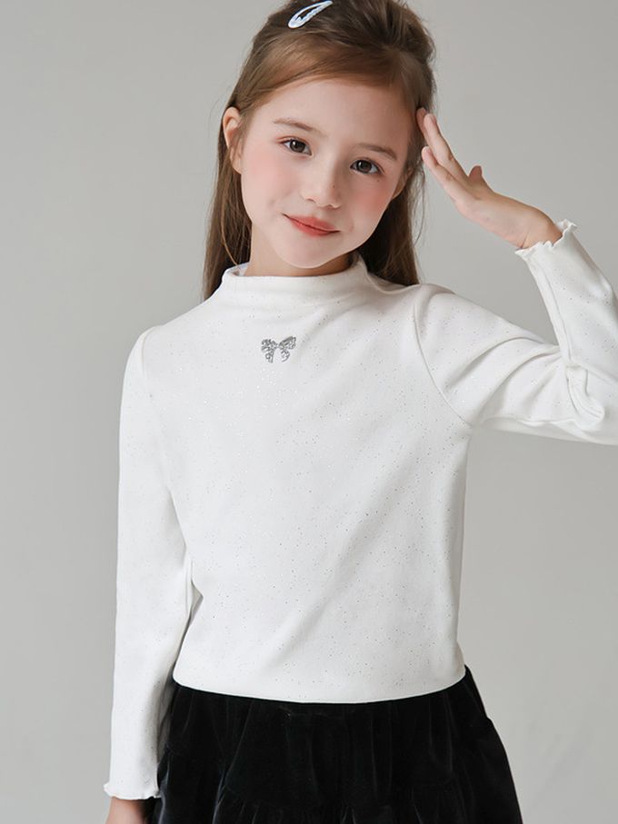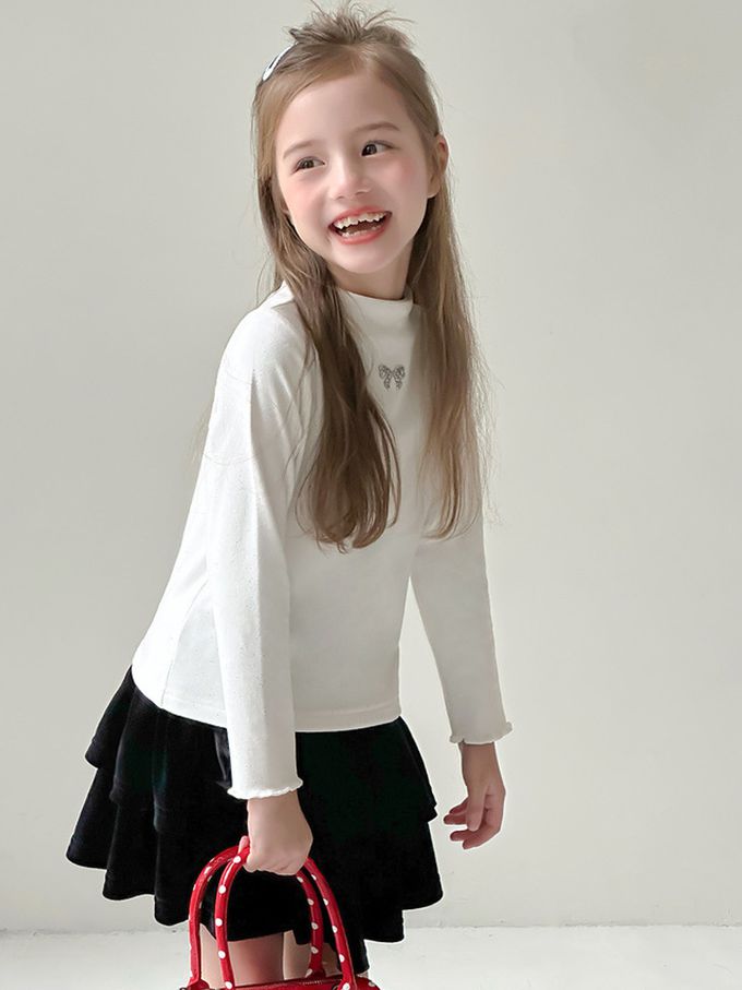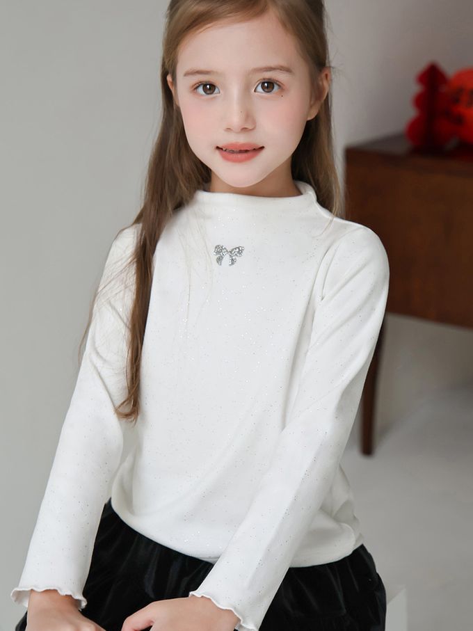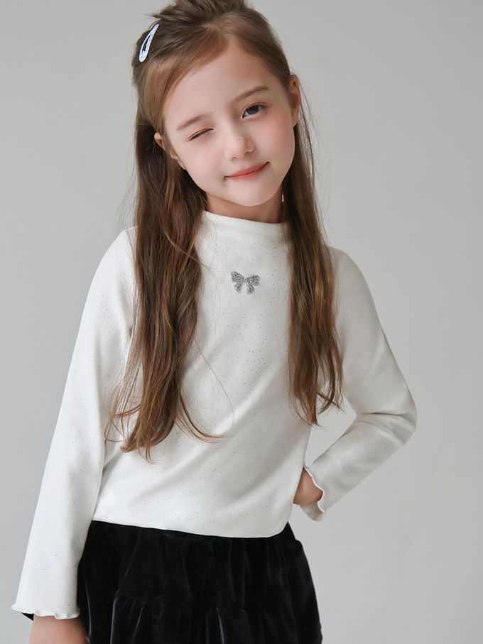 閃耀星空高彈木耳邊長袖上衣-蝴蝶結鑽飾-白色