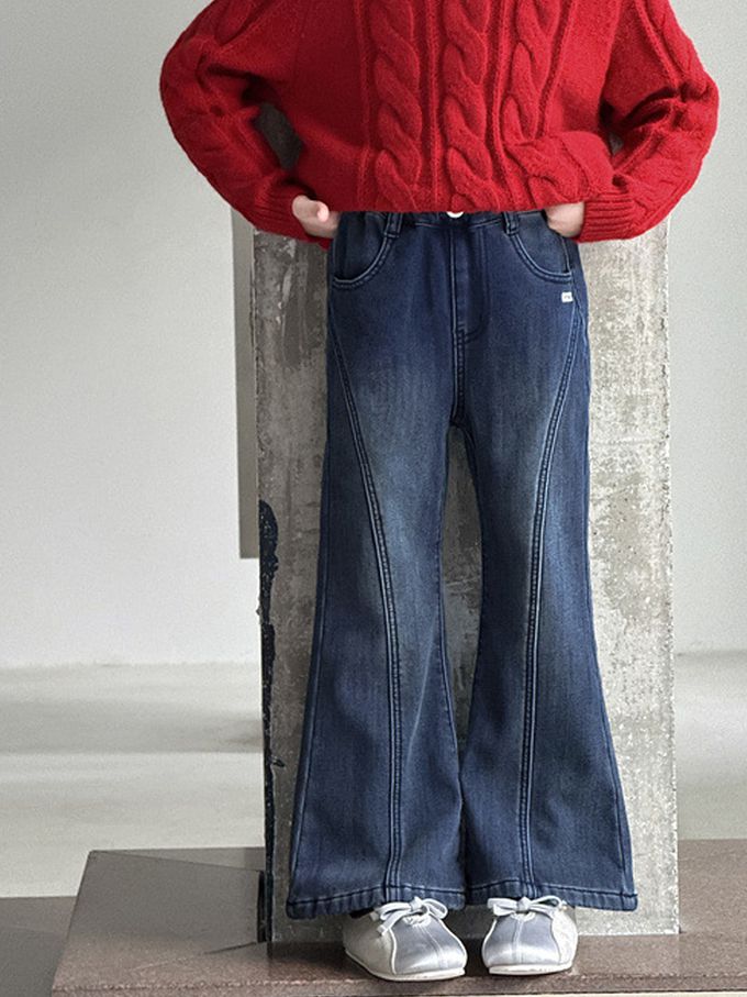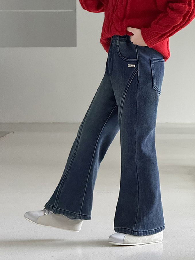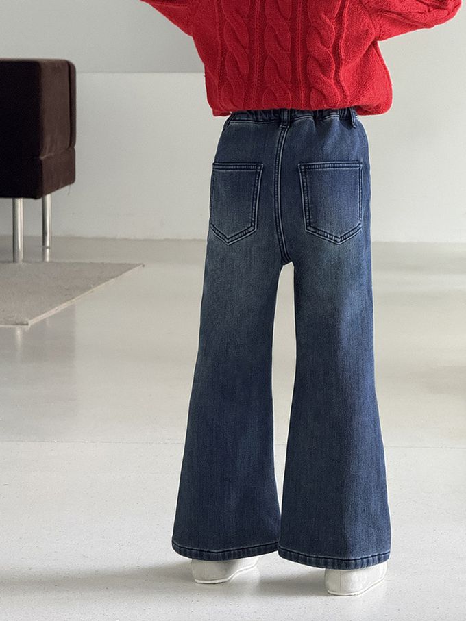 腰鬆緊加絨保暖牛仔喇叭褲-藍色