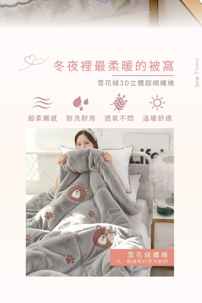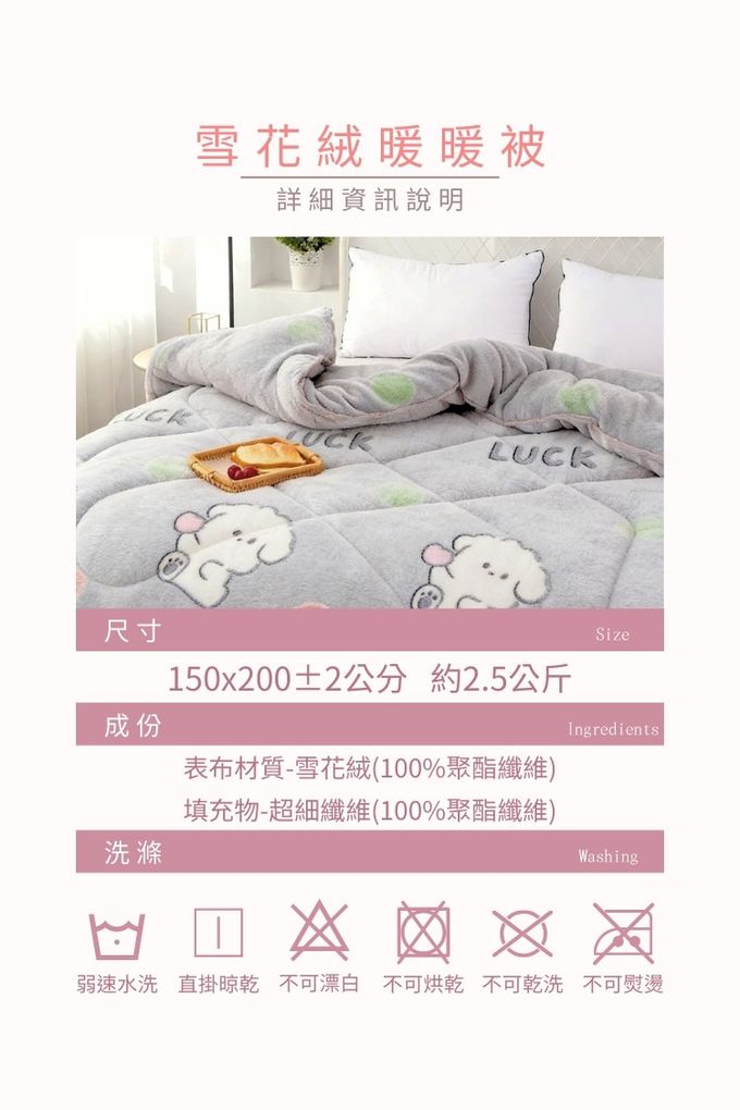 -件數:1件組-尺寸:150x200cm (約2.5kg)-材質-表布:雪花絨(100%聚脂纖維)填充物:超細纖維(100%聚脂纖維)