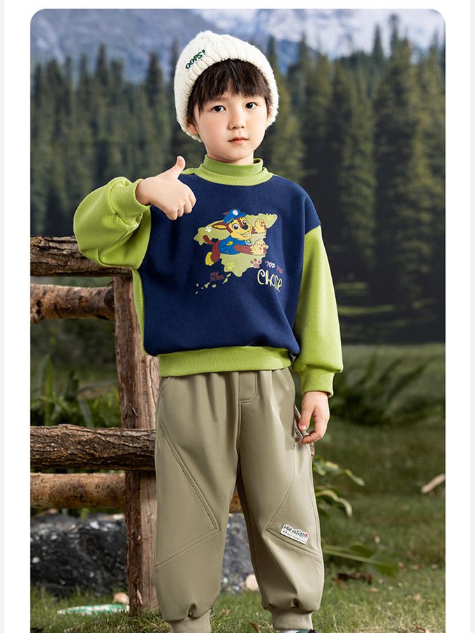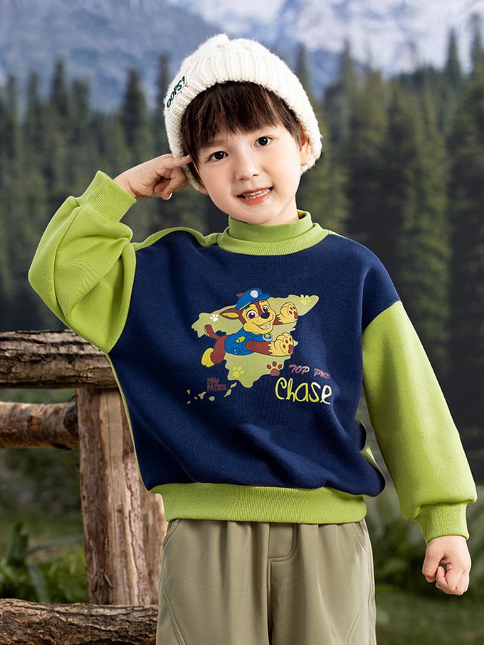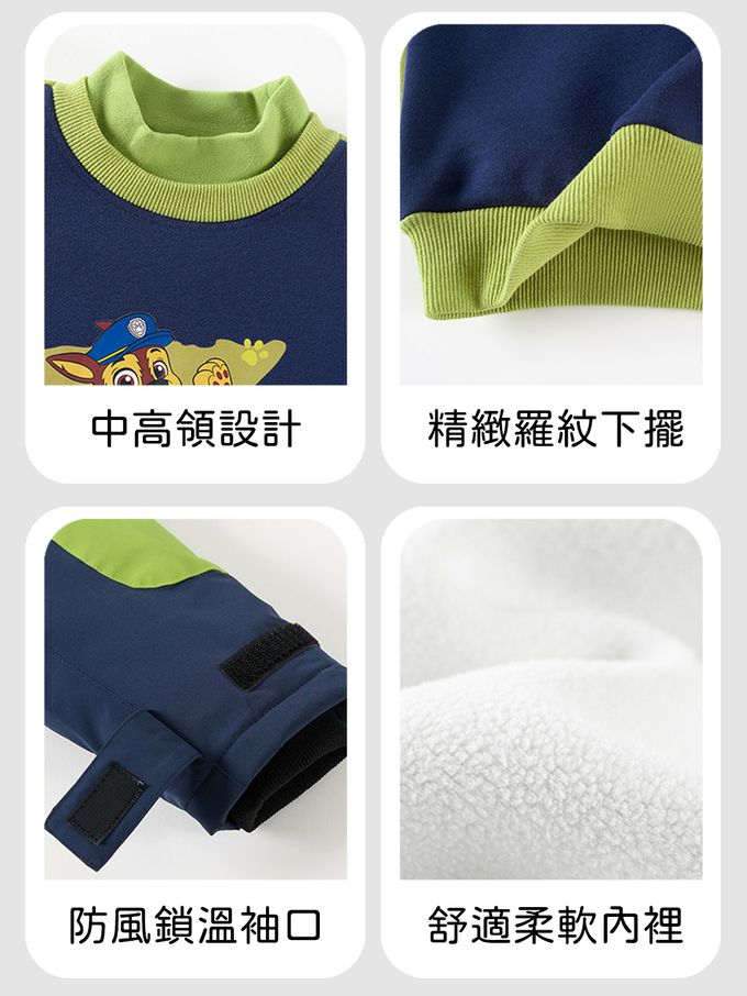 卡通汪汪隊加絨半高領假兩件長袖上衣-卡通人物阿奇-藏青x綠