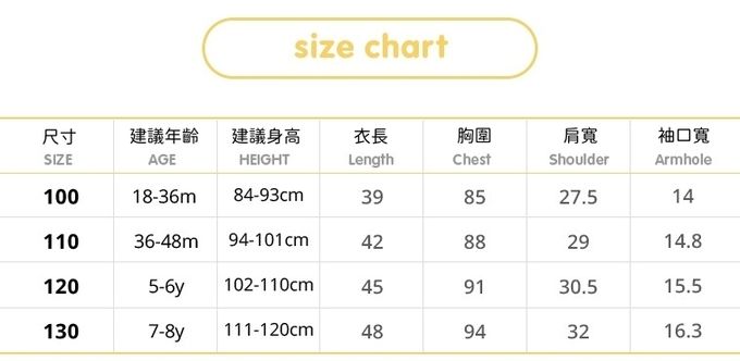 1. 尺寸表單位皆為公分(cm),實際尺寸會因布料彈性、水洗、測量起迄點等因素略有誤差。建議參考孩子平時穿著衣物尺寸進行選購。