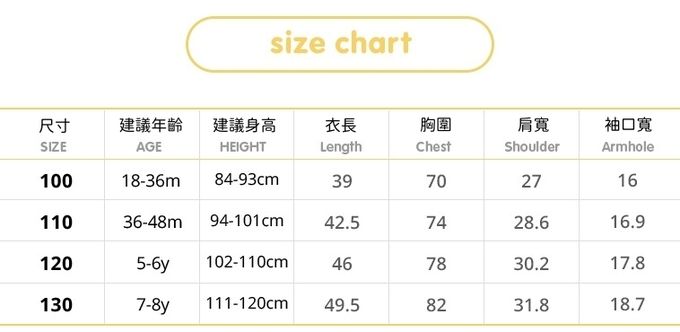 1. 尺寸表單位皆為公分(cm),實際尺寸會因布料彈性、水洗、測量起迄點等因素略有誤差。建議參考孩子平時穿著衣物尺寸進行選購。