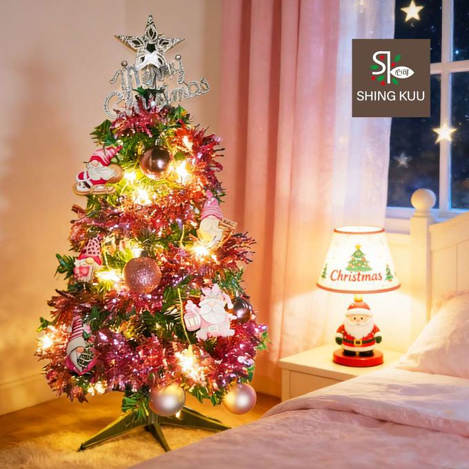 2尺60cm小美好套裝聖誕樹+2號夢幻粉紅聖誕老人彩繪木片飾品組+LED暖白光20燈雪花燈串_台灣本島免運費