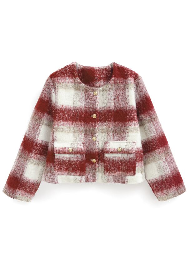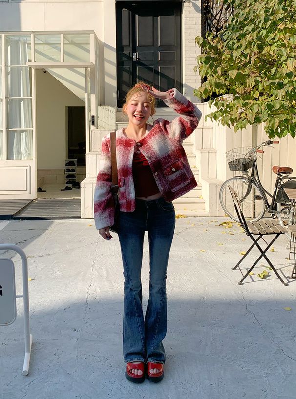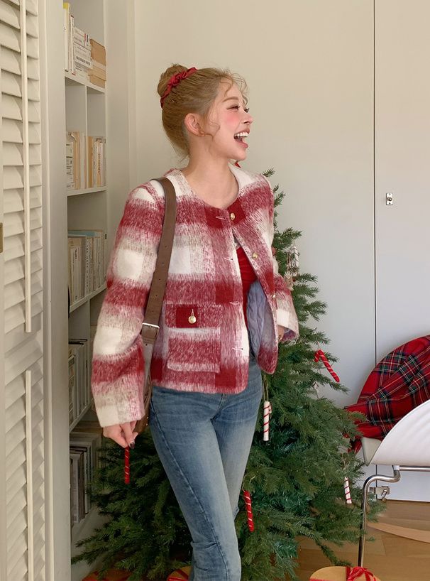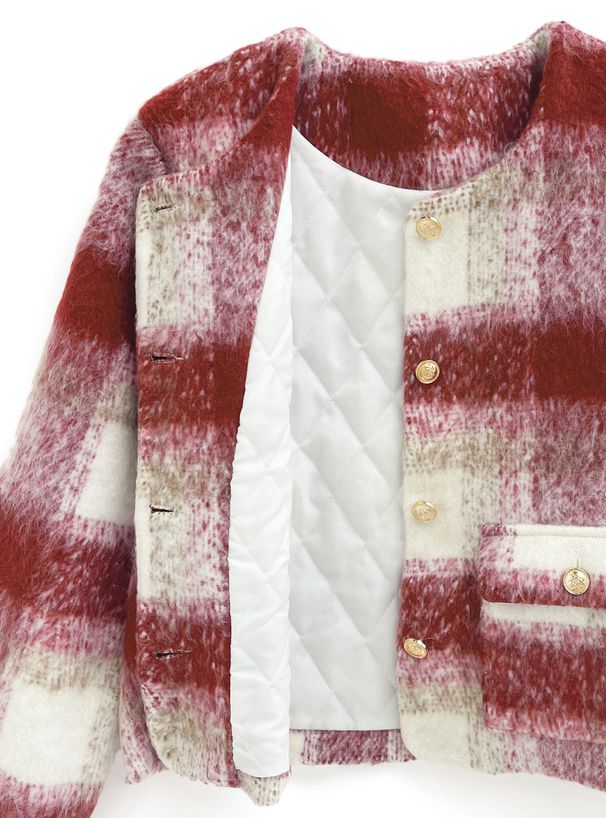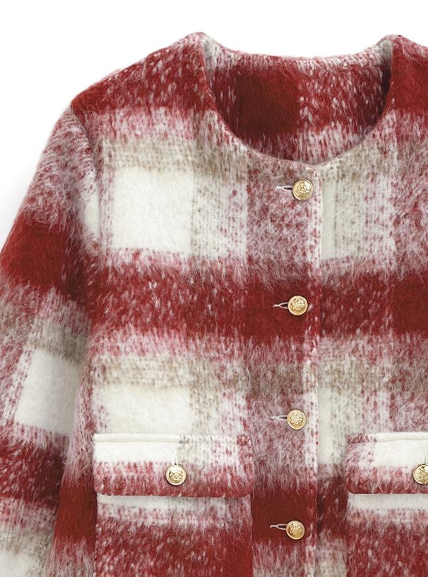 日本 GRL - 復古感格紋甜美毛海無領外套-紅 (F)