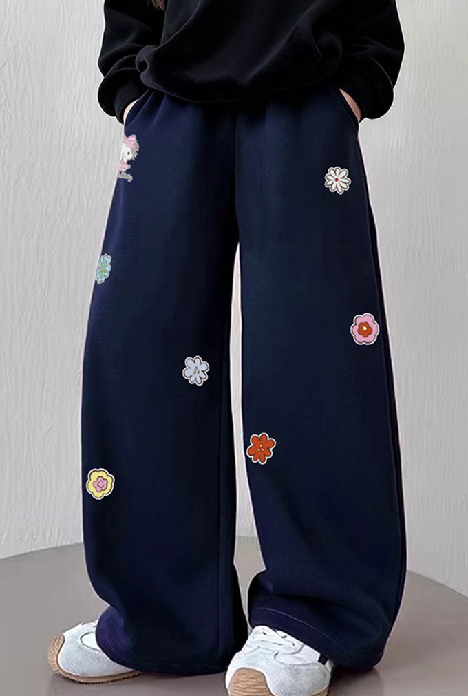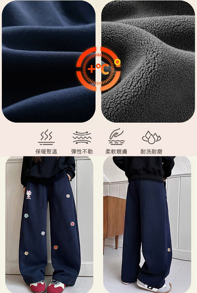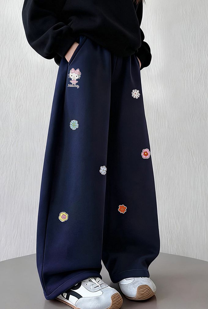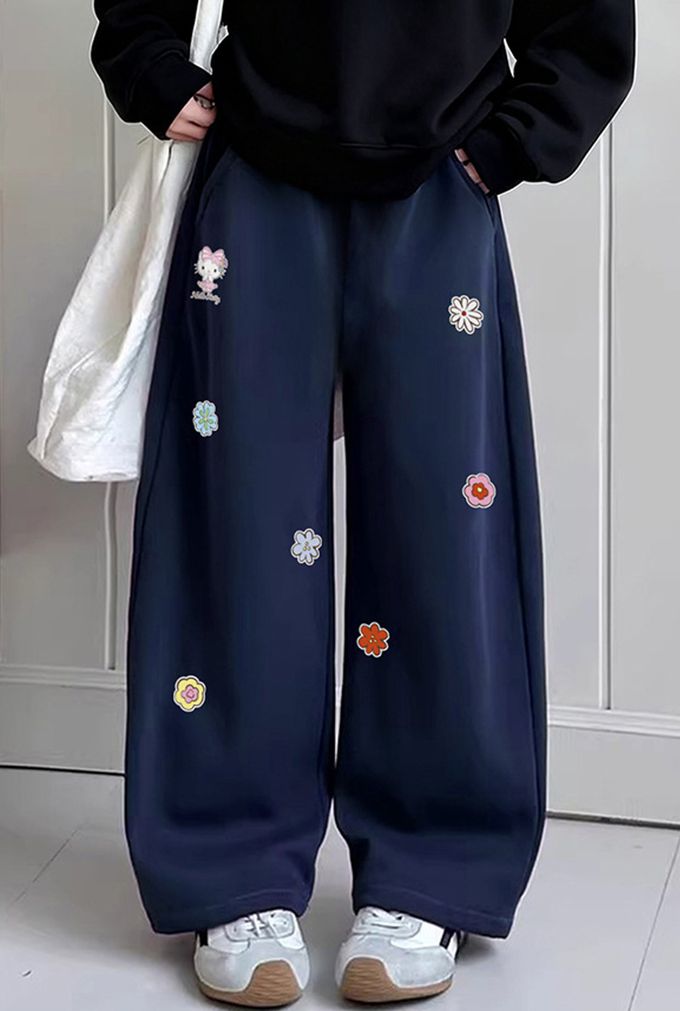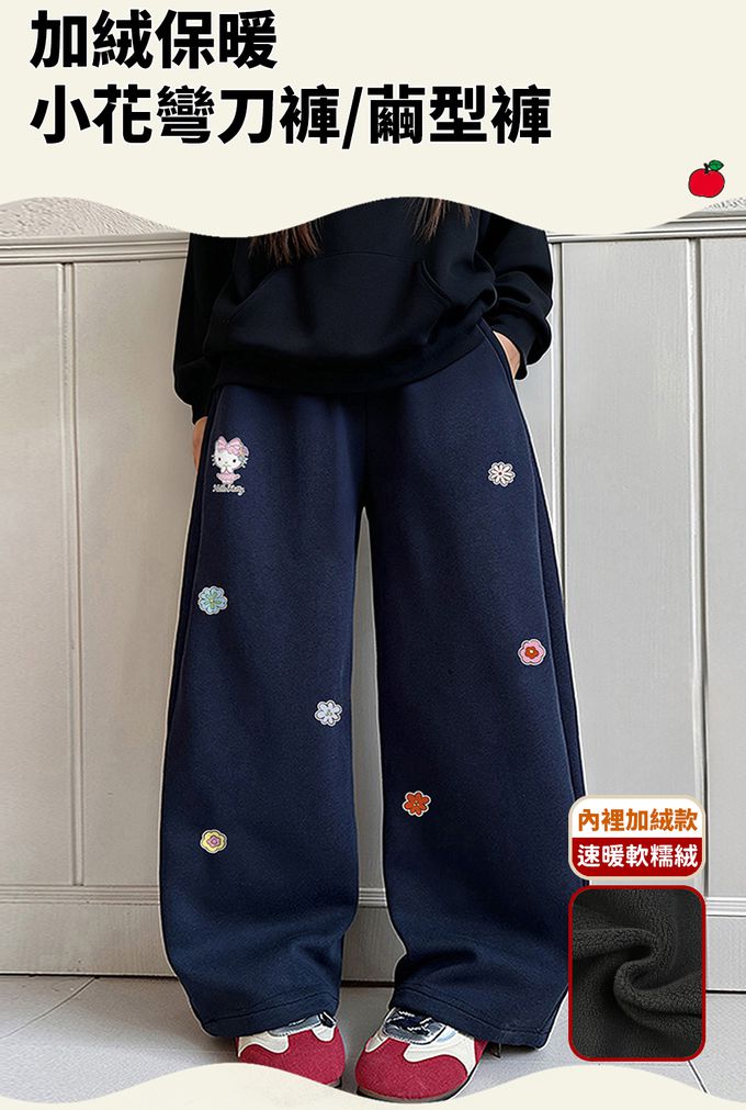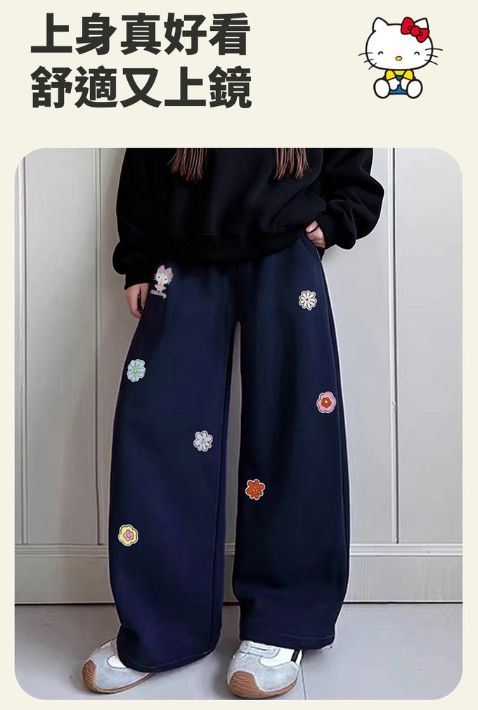 加絨保暖小花彎刀褲/繭型褲-卡通人物Hello Kitty-藏青