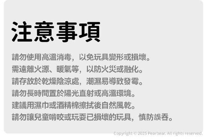 注意事項:為維護兒童安全,請在成人監督下使用,本玩具內 含小物件,有銳邊或尖端,或者兩者皆有,不適合 未滿3歲兒童使用,且應避免吞食造成窒息。為避 免嬰兒或兒童產生窒息之危險,請於拆卸後,立即 將塑膠袋遠離嬰兒及兒童。請遠離火源。
