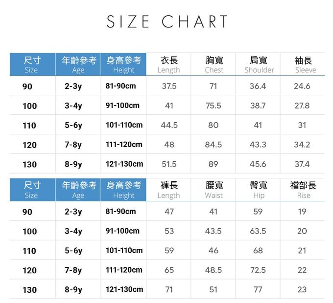 1. 尺寸表單位皆為公分(cm),實際尺寸會因布料彈性、水洗、測量起訖點等因素略有誤差。(尺寸表以平均體型為基準制定,根據個人差異可能會有所不同,僅供參考。)