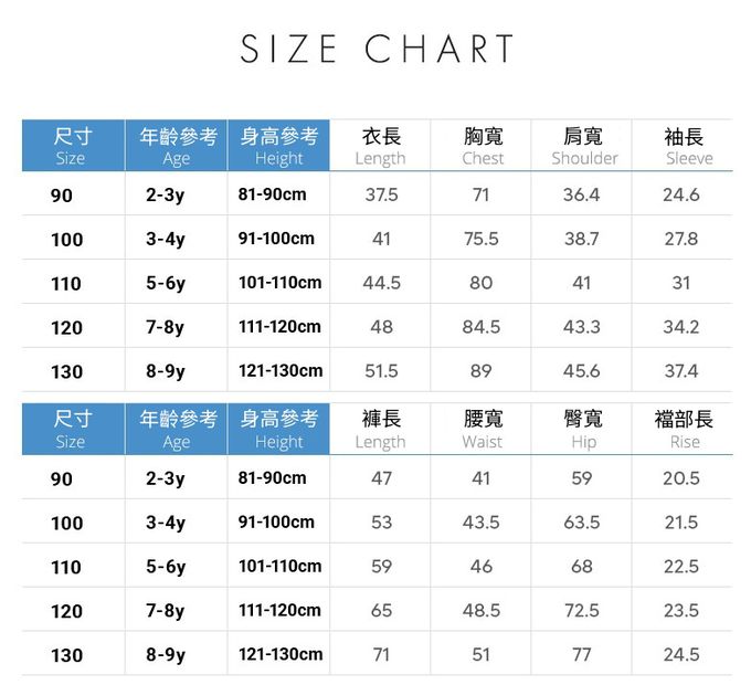 1. 尺寸表單位皆為公分(cm),實際尺寸會因布料彈性、水洗、測量起訖點等因素略有誤差。(尺寸表以平均體型為基準制定,根據個人差異可能會有所不同,僅供參考。)2. 第一次穿之前,建議手洗或乾洗。3. 請以30度以下冷水洗滌,溫水可能會造成移染或掉色。4. 深淺色請分開洗滌,避免造成互相移染。請使用中性洗劑。浸泡時間不宜過長。5. 衣物若含圖案、印花等設計均建議手洗;如需機洗,請務必將衣服翻面放入洗衣網、再放洗衣機,以免刮損圖樣。6. 請勿使用漂白劑、螢光增白劑及衣物柔軟劑,以免破壞布料或導致掉色。7. 洗滌後立刻晾乾,勿使用烘衣機。過分烘乾可能會破壞織物纖維、導致衣物收縮。如有熨燙需求,請低溫熨燙。8. 每件商品於拍攝時均力求忠實呈現,但因每台電腦、手機或平板等設備之螢幕亮度、解析度不同,可能會有些許色差,謝謝媽咪爸比們的體諒。