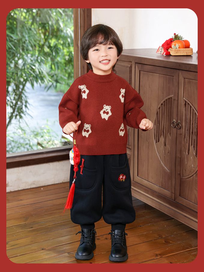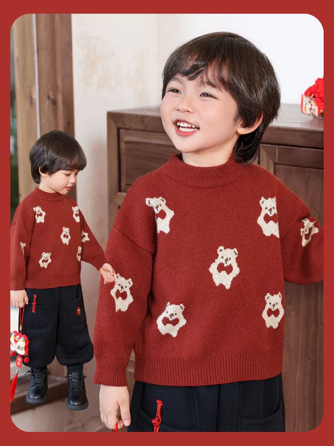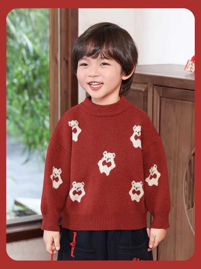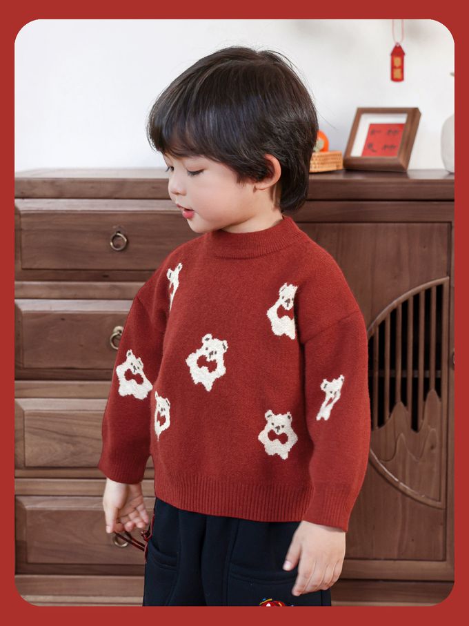 BOMI - 加厚保暖針織長袖上衣-領結小熊-紅色