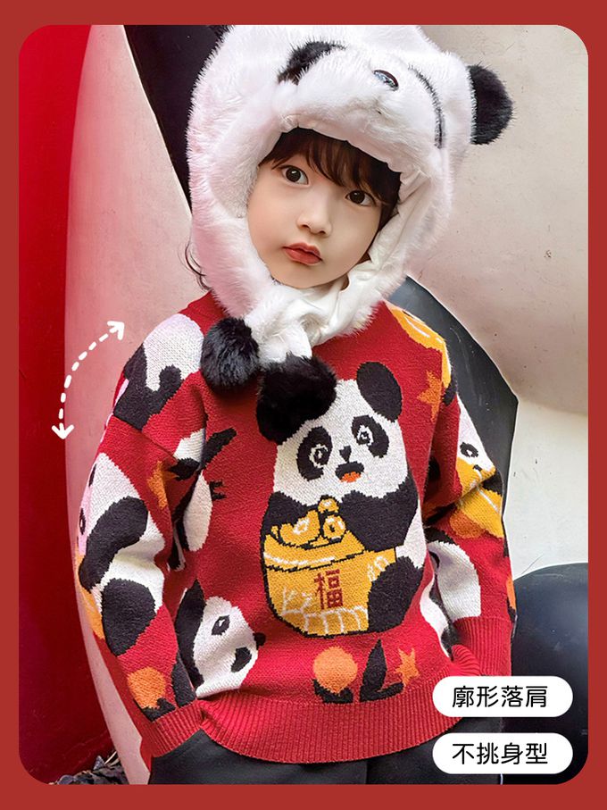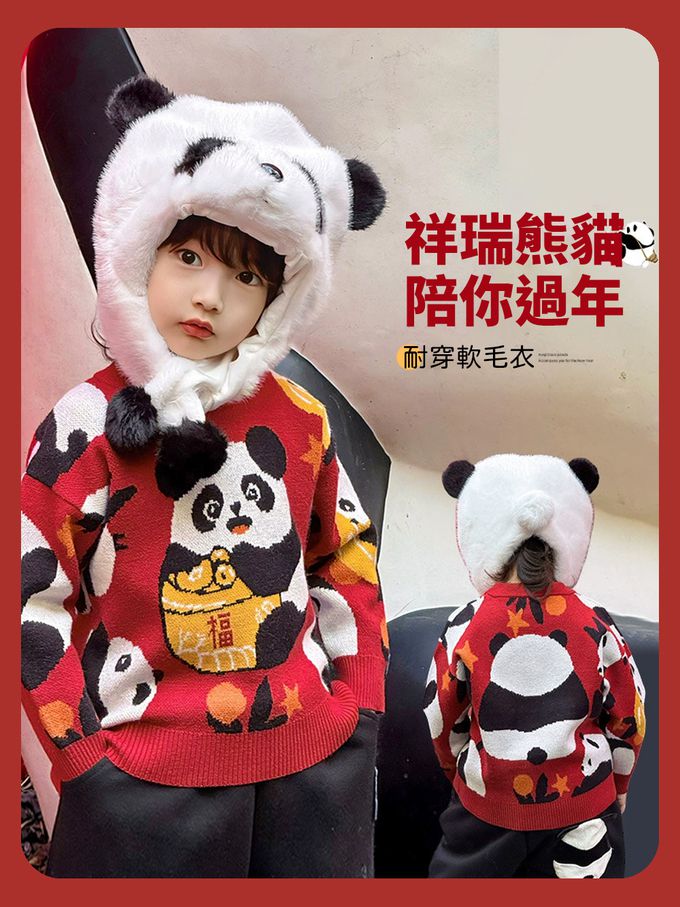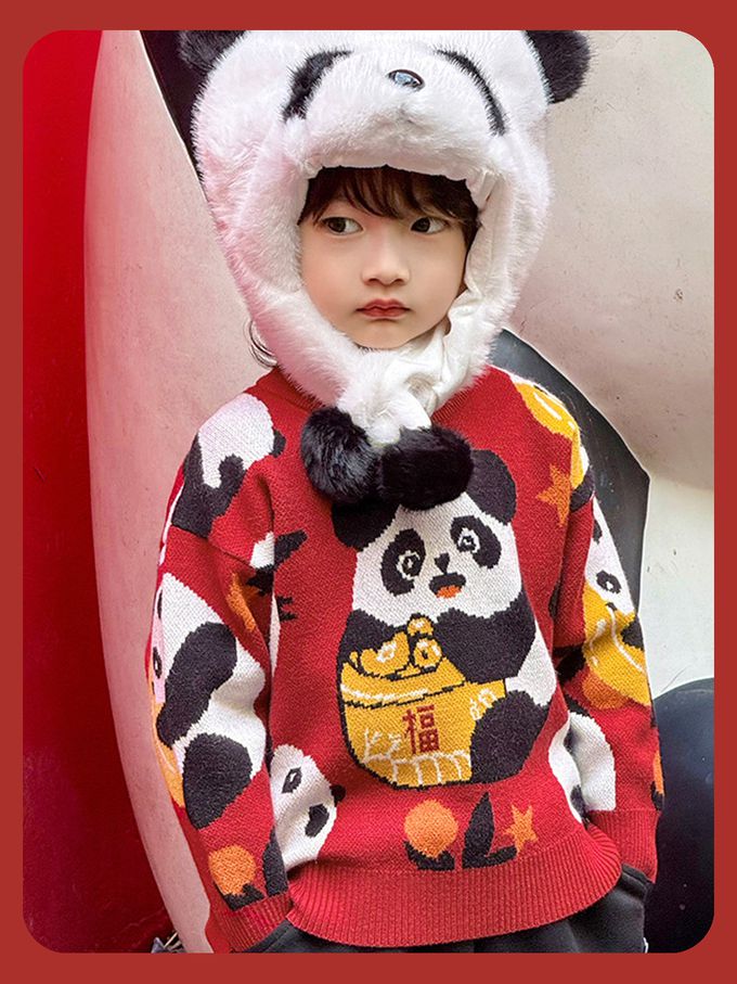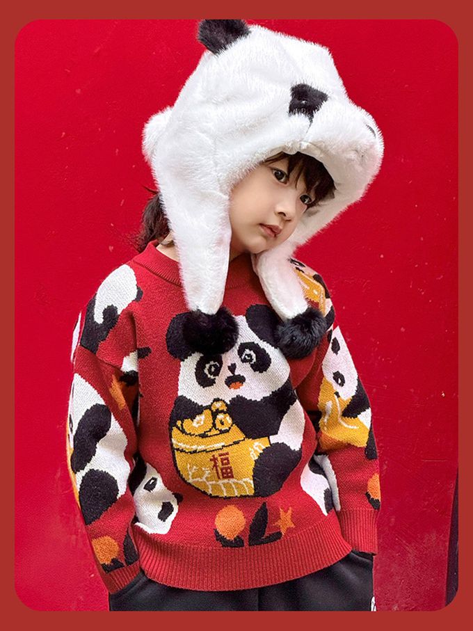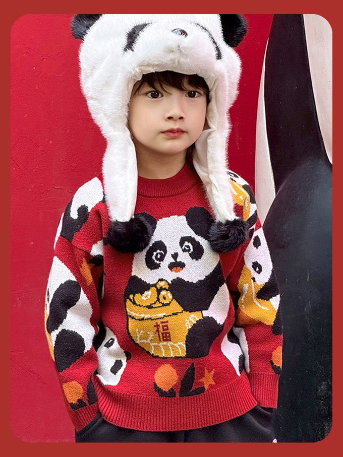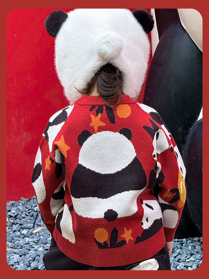 加厚保暖針織長袖上衣-熊貓抱福-紅色