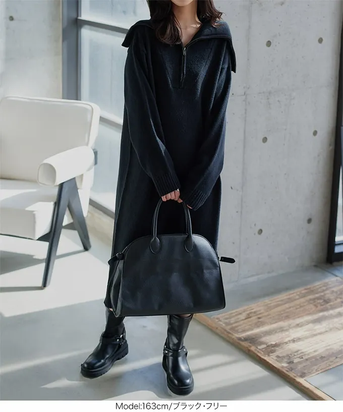 日本 Kobe Lettuce - 半拉鍊修身大翻領柔美針織長袖洋裝-黑