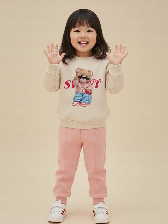內刷絨長袖上衣+長褲套裝-萌動新春-米白x粉