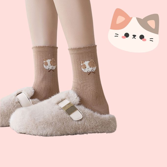 卡其毛毛花貓千鳥格中筒棉襪
