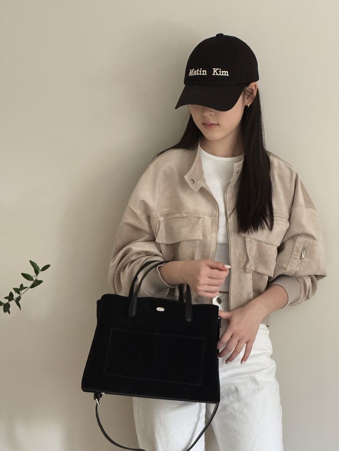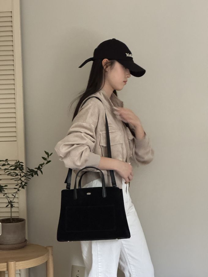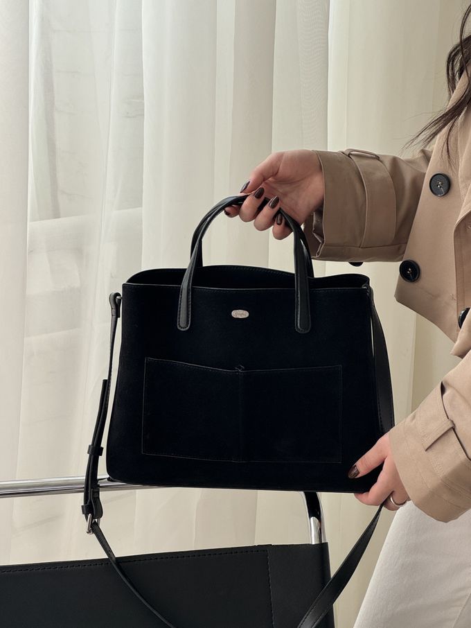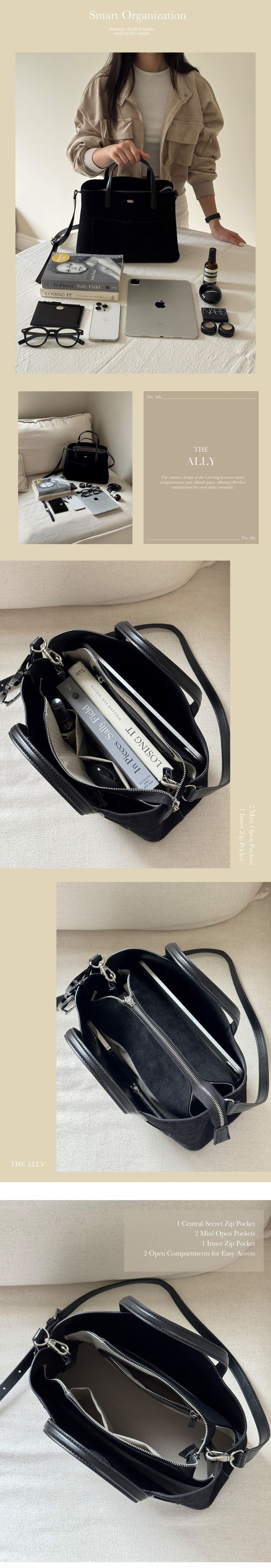 韓國 THEALLY - 小眾設計 多夾層分隔收納質感麂皮手提/斜背包-黑