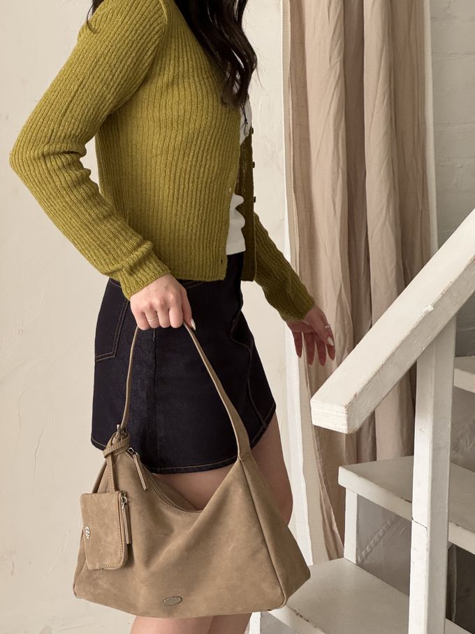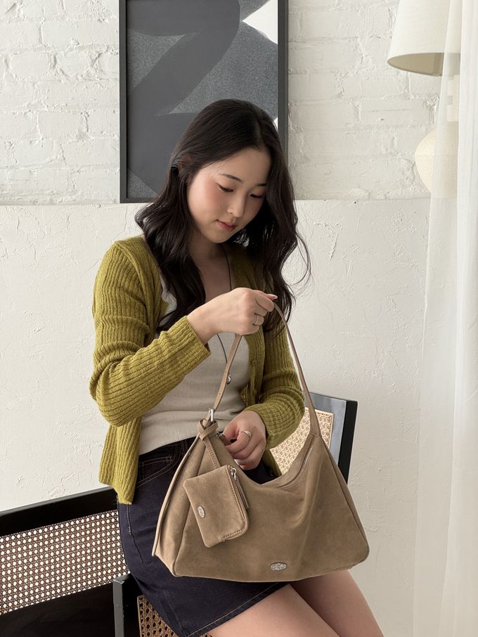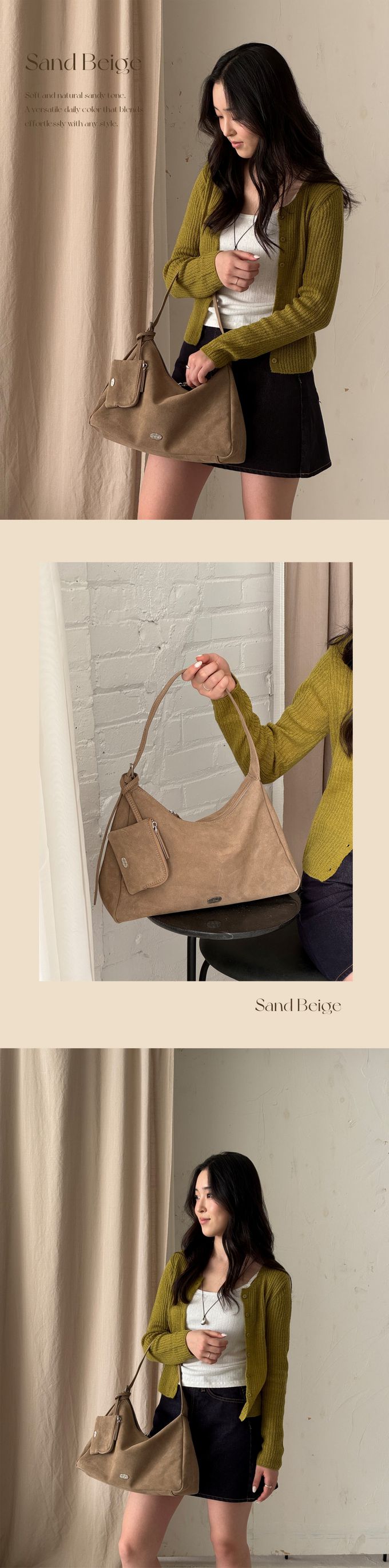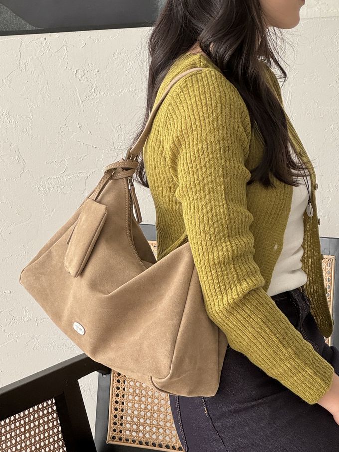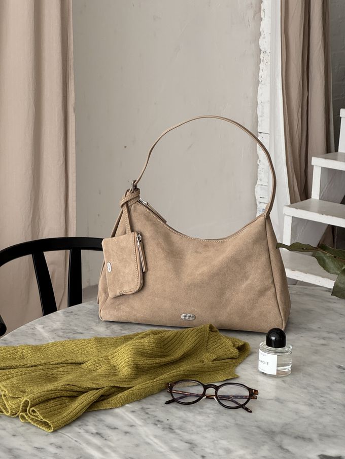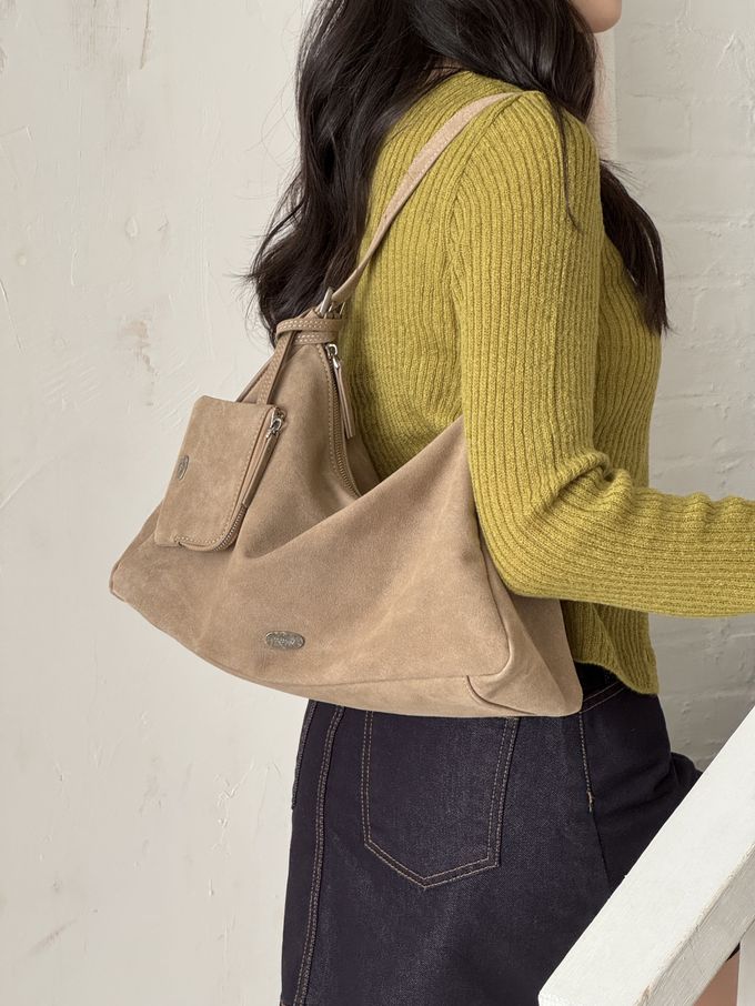 韓國 THEALLY - 小眾設計 (附小拉鍊包)100%高級牛皮輕量耐裝肩背包-沙棕杏