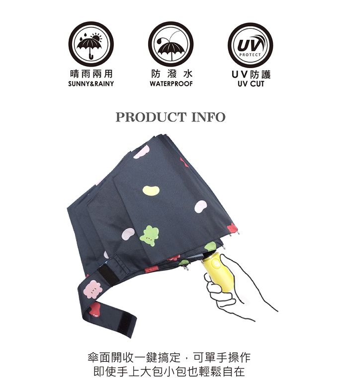 使用方式:使用前,先輕輕地晃動雨傘,使其傘布較為鬆開,再行展開雨傘。