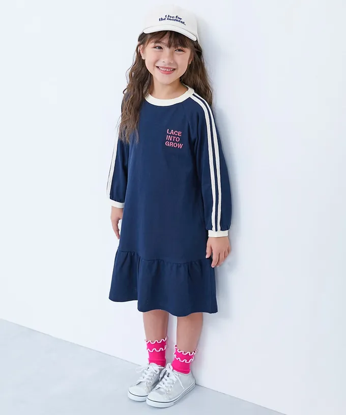 日本 devirock - 純棉運動風荷葉下擺長袖洋裝-煙燻藍