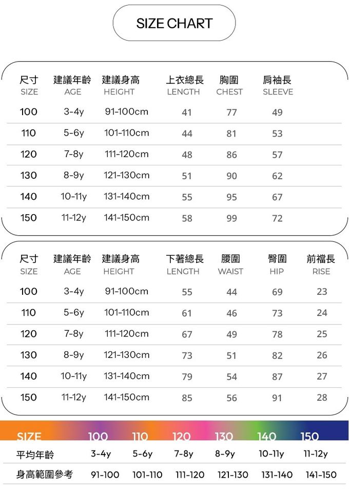 1. 尺寸表單位皆為公分(cm),實際尺寸會因布料彈性、水洗、測量起迄點等因素略有誤差。建議參考孩子平時穿著衣物尺寸進行選購。