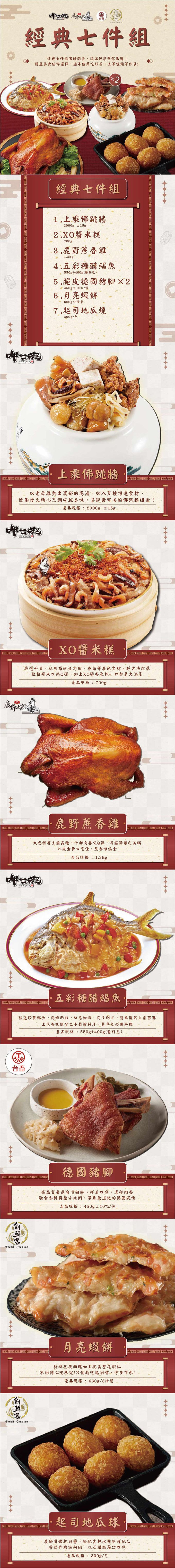 經典七件組-佛跳牆+XO醬米糕+蔗香雞+糖醋鯧魚+德國豬腳+月亮蝦餅+起司地瓜球