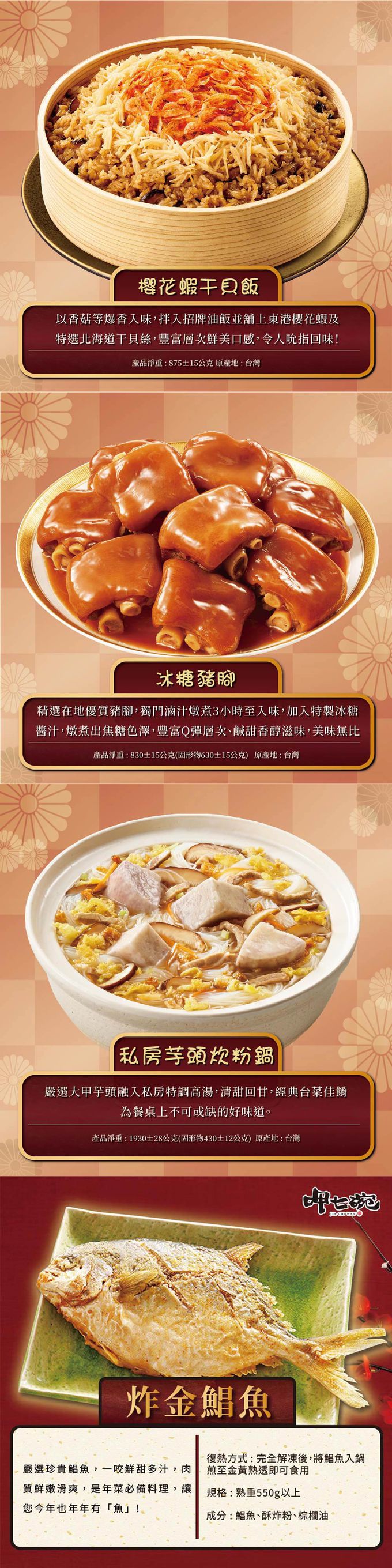 富貴年菜7件組A-(鮑魚干貝佛跳牆+火烔雞湯+經典牛雙寶+太子油飯聯名櫻花蝦干貝飯+冰糖豬腳+芋頭炊粉鍋)+酥炸金鯧魚
