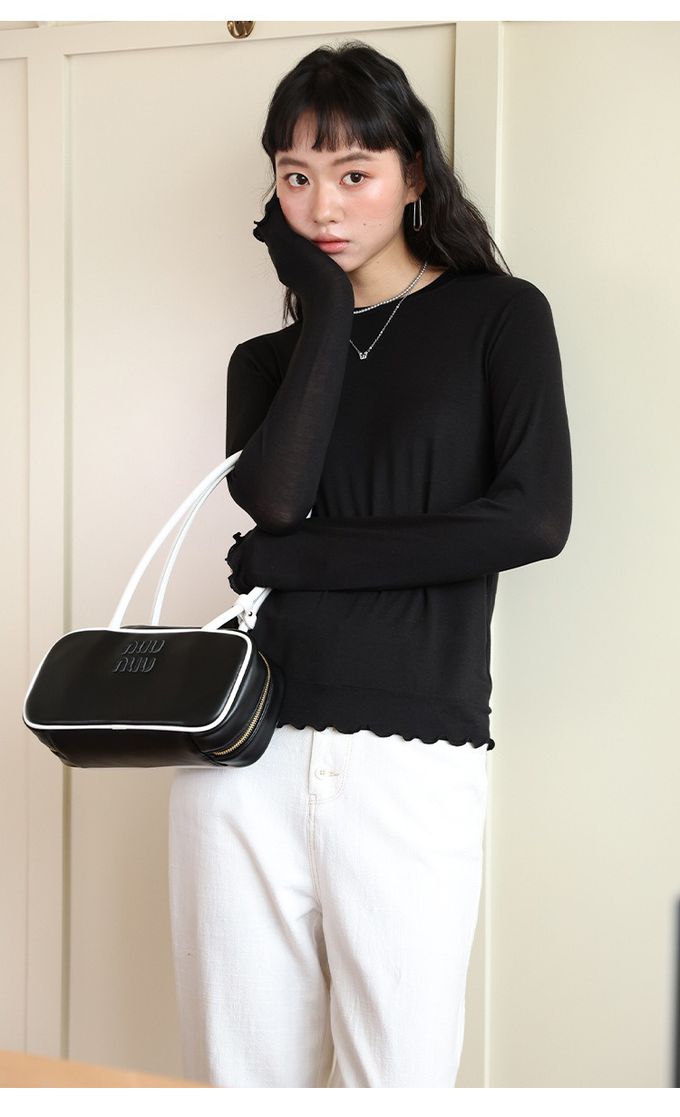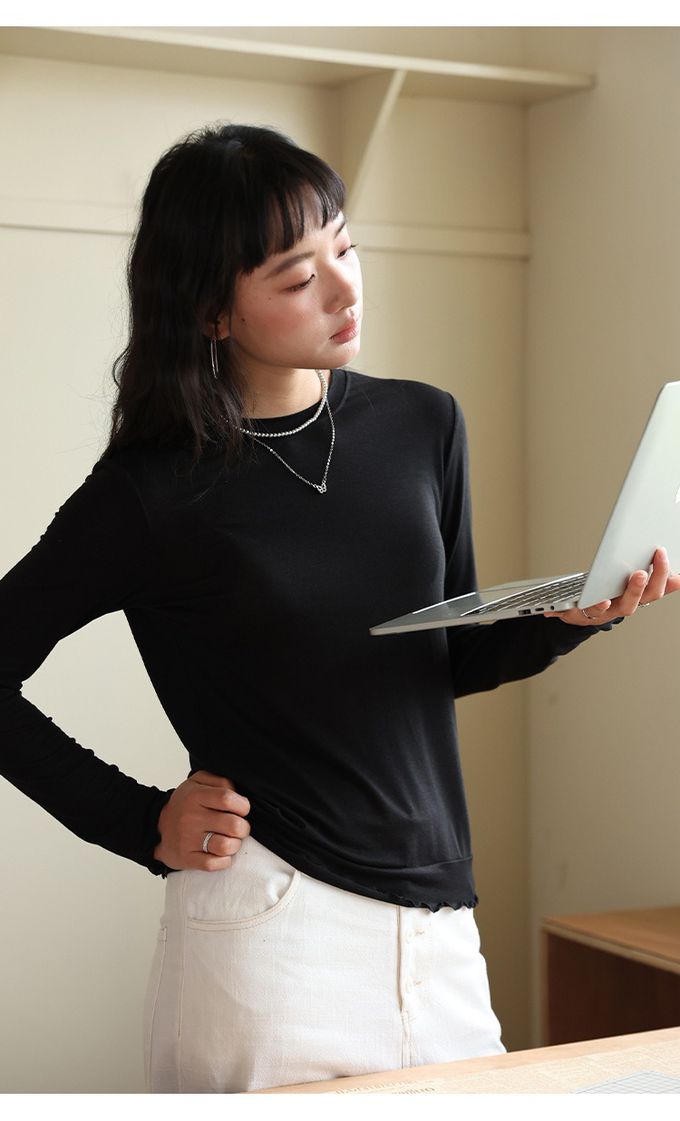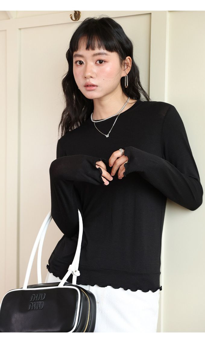 KPUWARM - 細緻綿柔3.2%羊毛天絲木耳邊長袖上衣-簡約黑